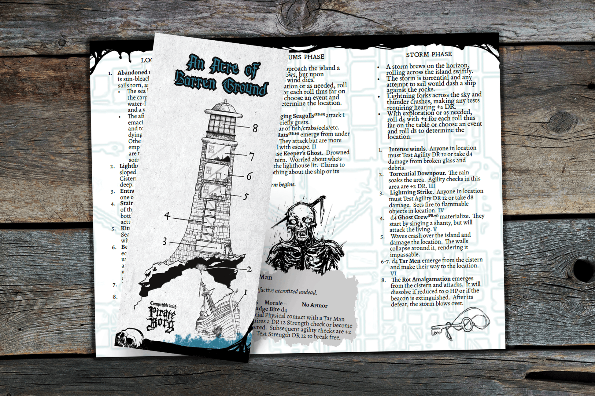 An Acre of Barren Ground is a brochure-style adventure inspired by the films The Lighthouse and Return of the Living Dead and is suitable for insertion into a regular Pirate Borg campaign or for play at a convention. An Acre of Barren Ground is a non-linear dungeon crawl with events that adjust the experience. In addition to the adventure, there is also a cocktail recipe included.