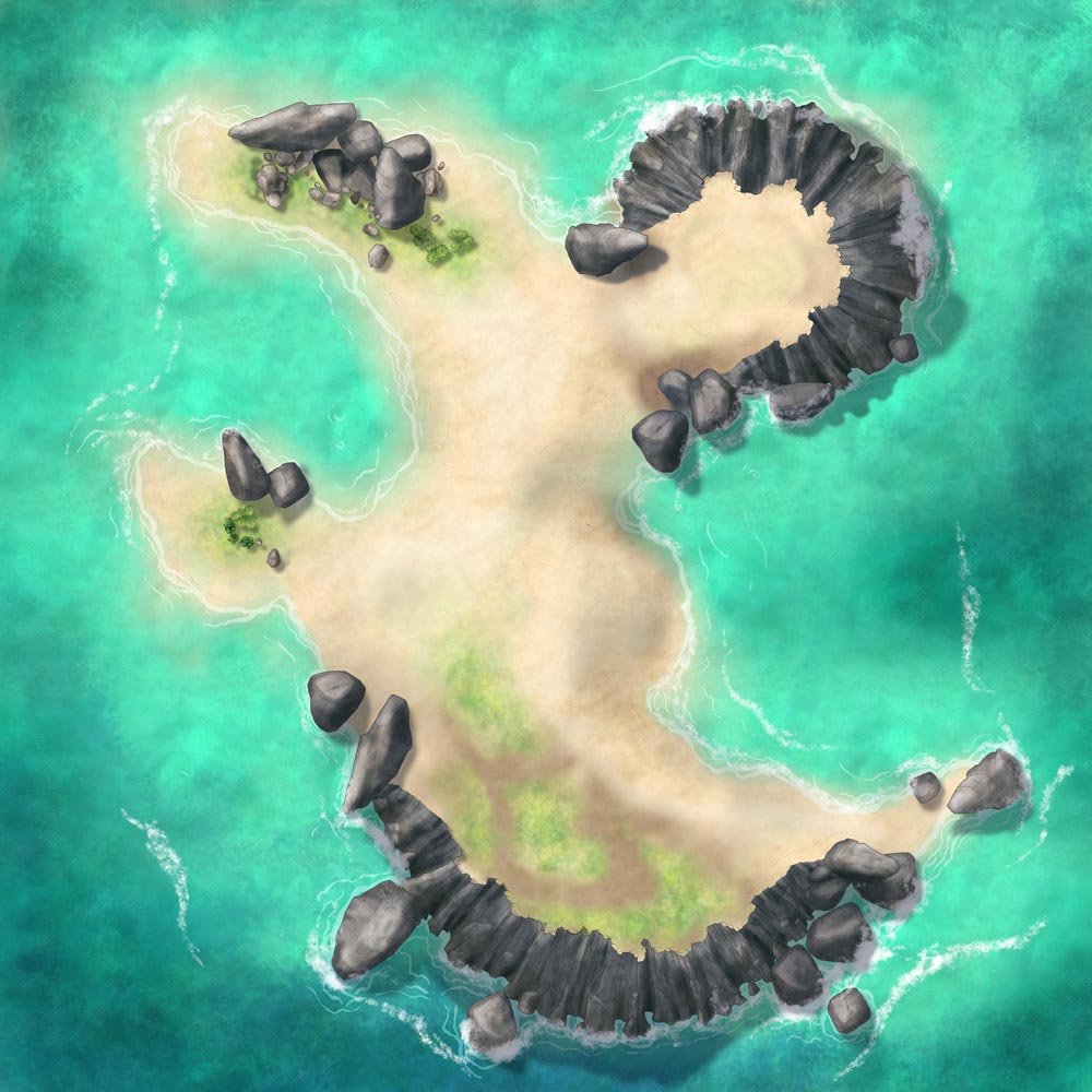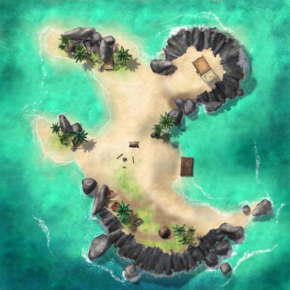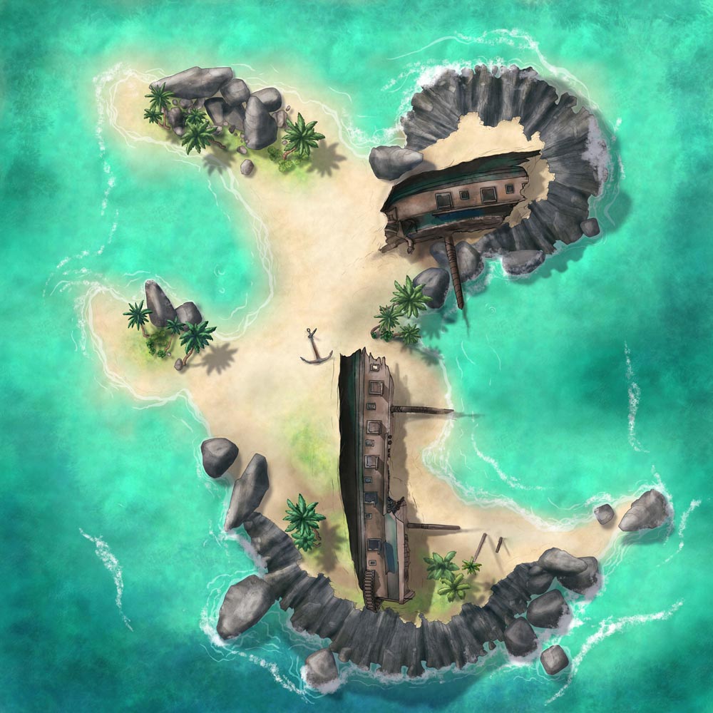 To cover a wide range of situations, there are 11 variations for Anchor Island. Among the options, I've included a version with a shattered shipwreck; with and without buildings; and an almost entirely blank version, to allow for better customization. All are non-gridded, hi-res JPEG files.