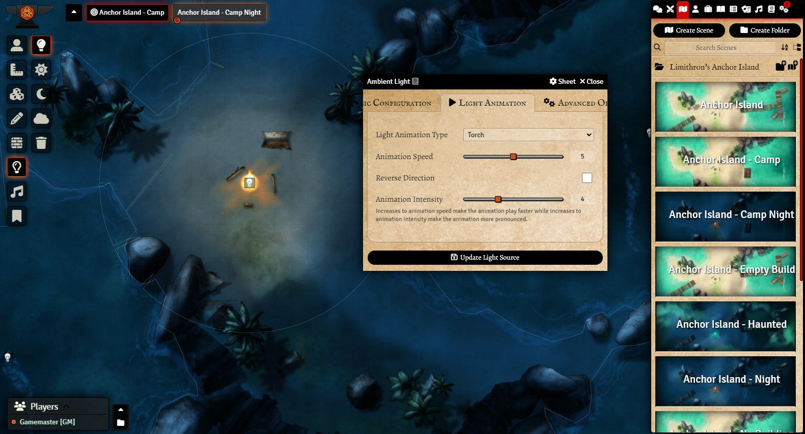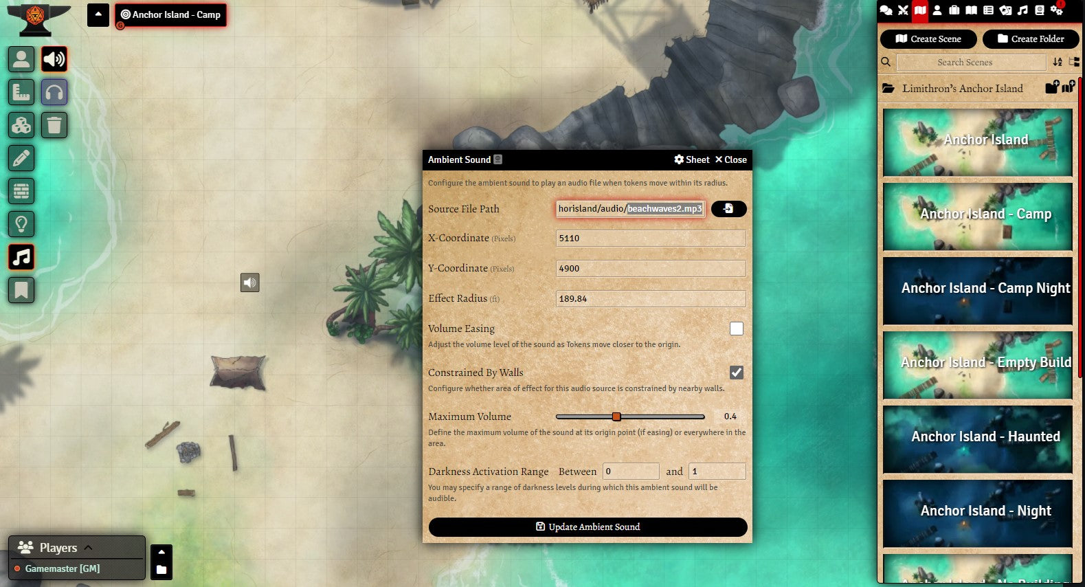 v11. The Foundry module is updated to v11, and includes sound effects; lighting for water, waves, fire and rain; walls and fog effects. Global illumination is on.