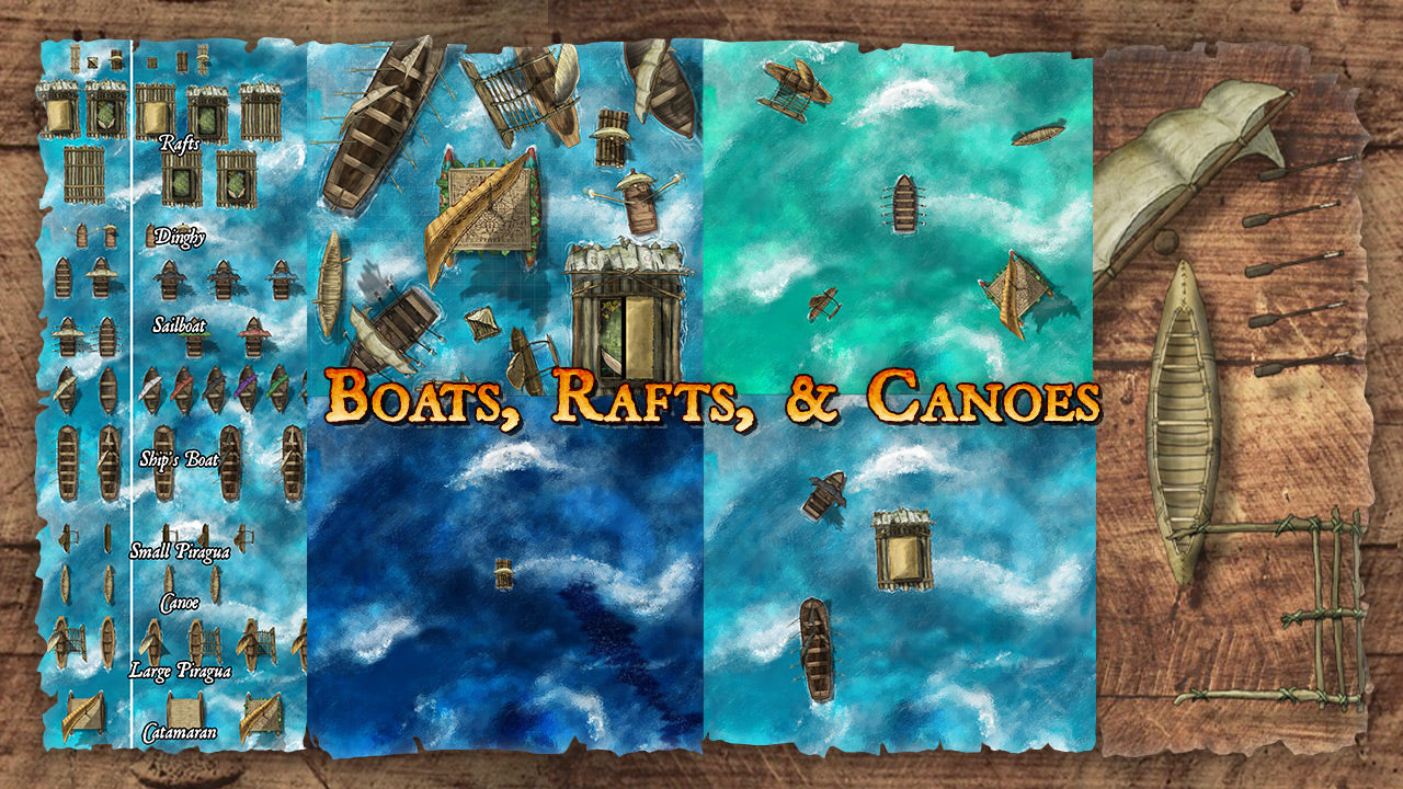This set will build out your supply of small sea vessels. In Boats, Rafts & Canoes, there are 58 different boat tokens, plus 4 water backgrounds, 33 assets to build your own boats, 1x1 tokens for naval combat, and 3 "scenes".