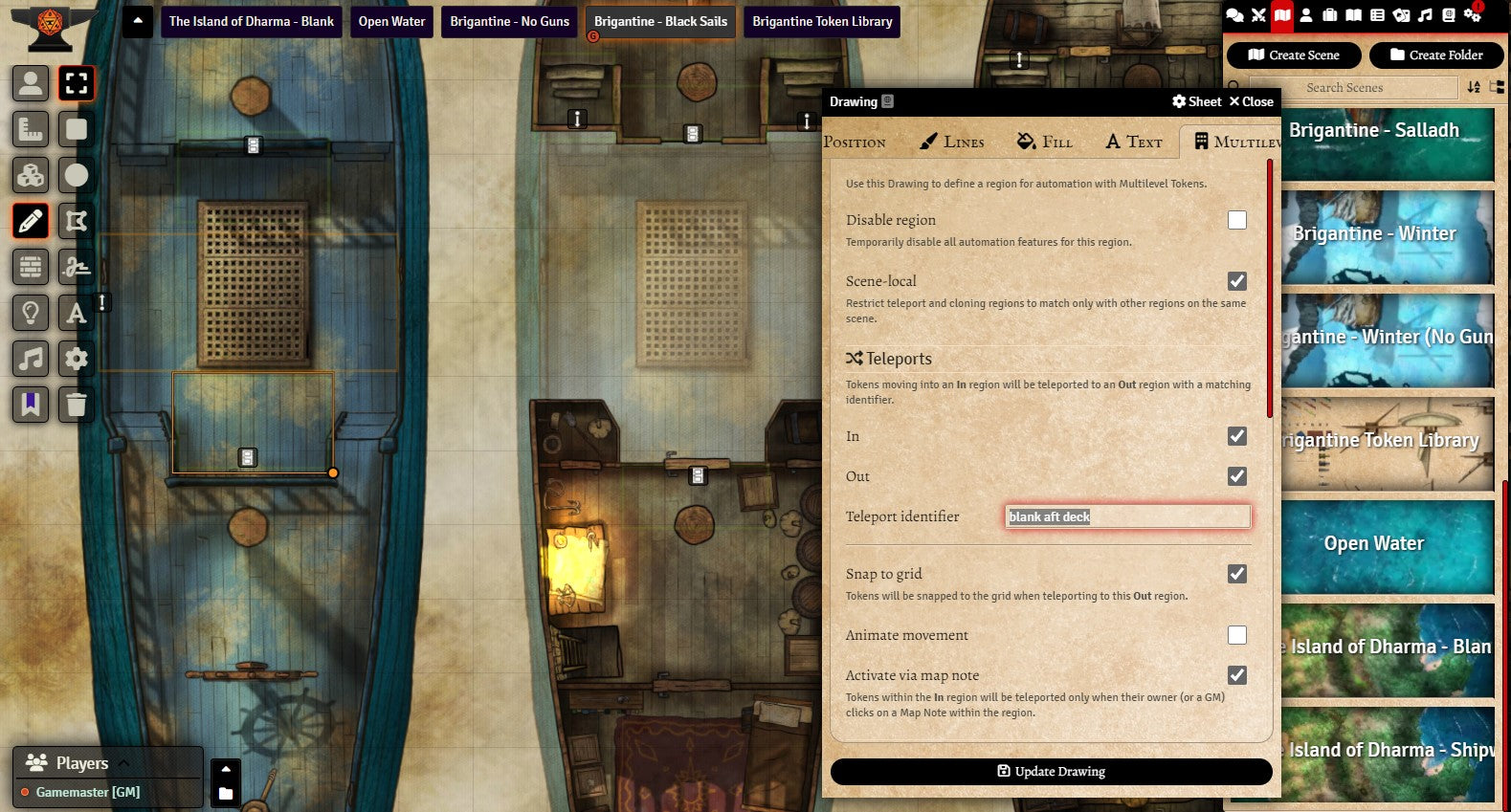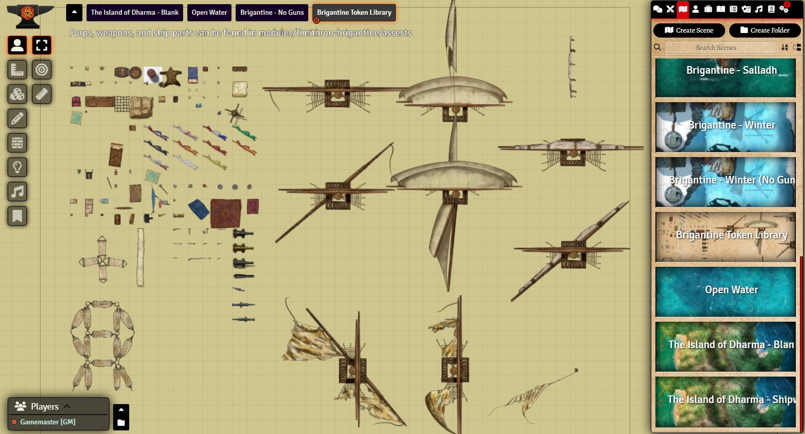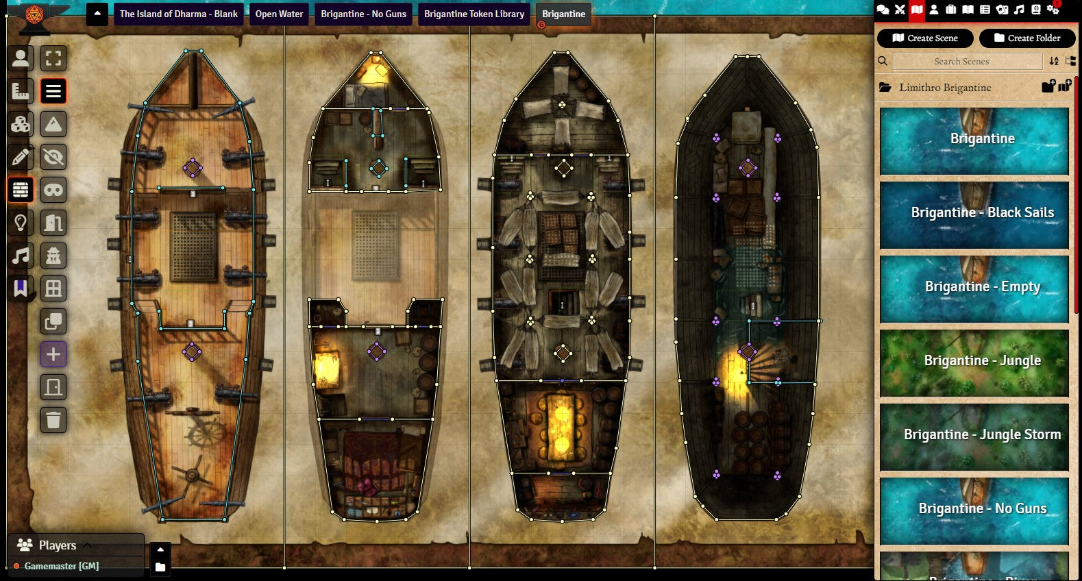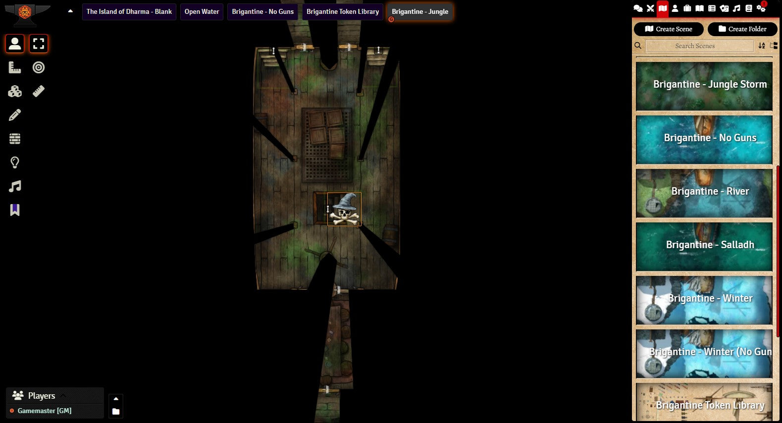 v11. The Brigantine Foundry module includes preset walls, lighting, and sound effects. Tile Scroll and Multilevel Token are required – the latter moves tokens from one deck of the ship to another.