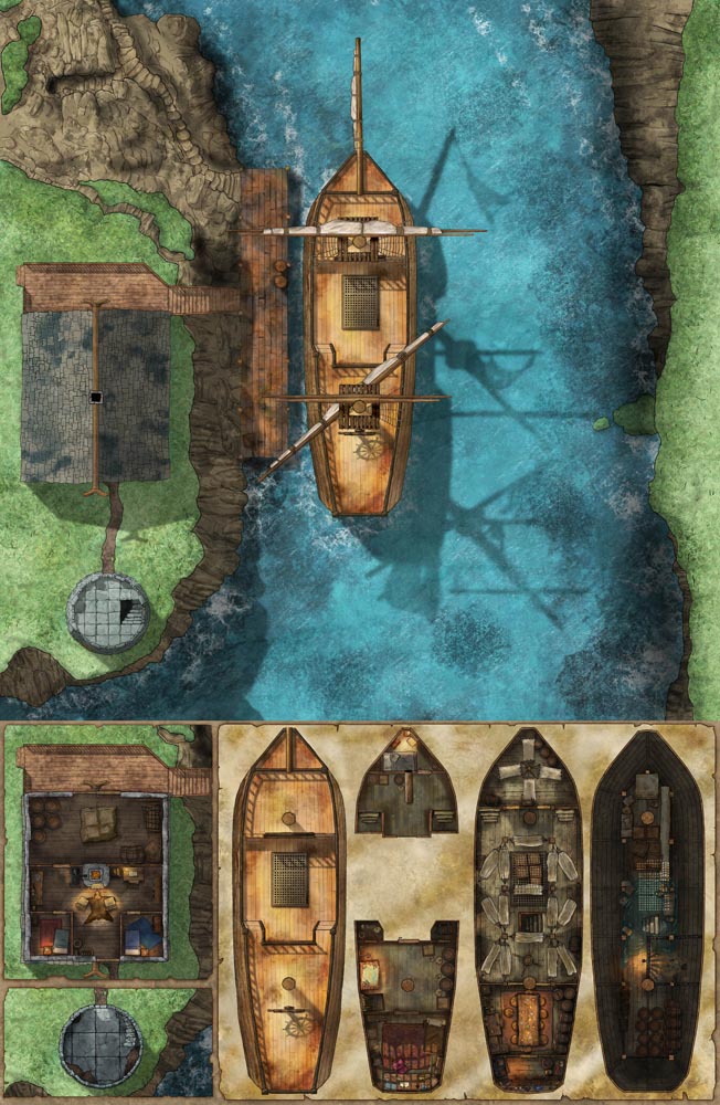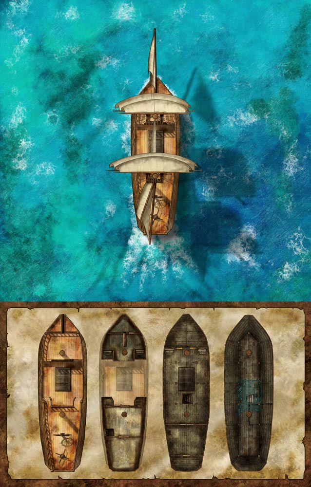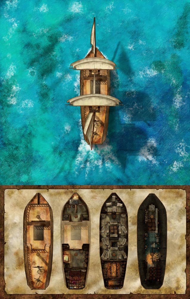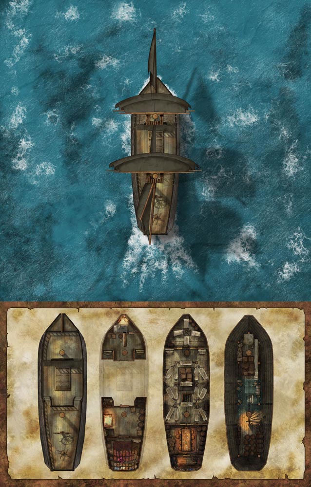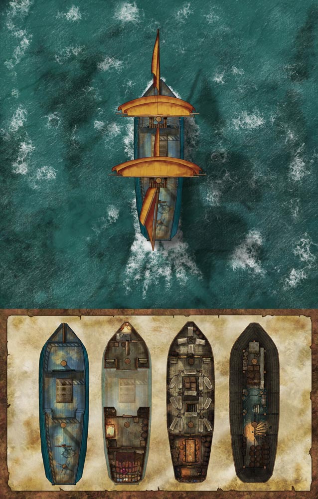 The Brigantine is the perfect vessel for a water based campaign. She is fast and agile and can pack enough gunpowder to be a serious threat, but small enough that you don't need a huge NPC crew to man it. There is enough room below the decks for a host of activities: quarters for the captain and quartermaster, a map room, crew hammocks, a galley (kitchen), a mess hall, a brig (jail), and a full cargo hold.