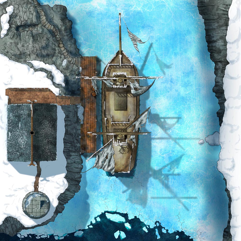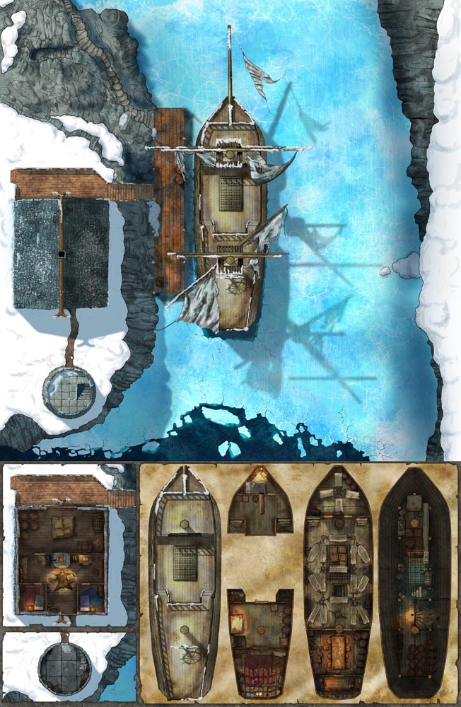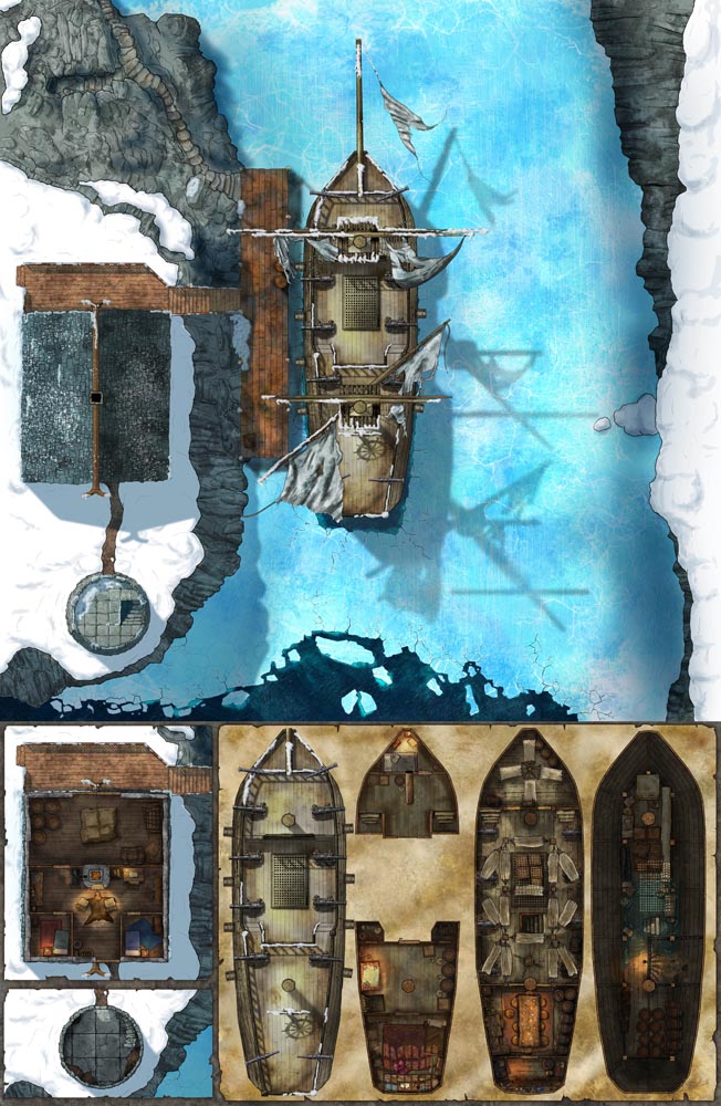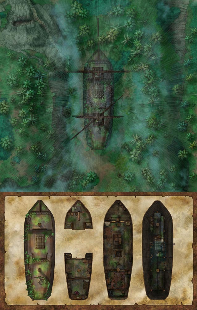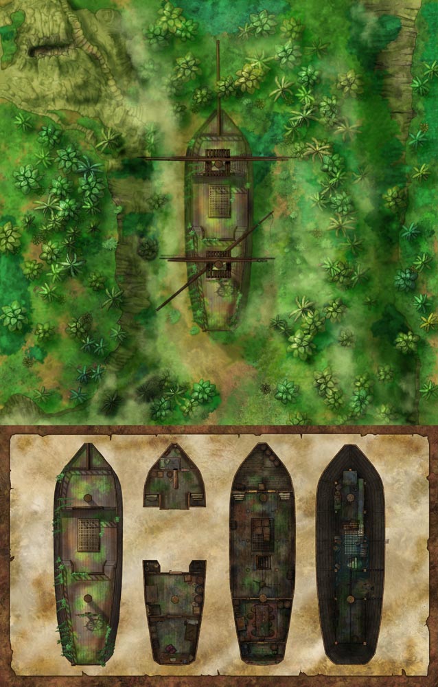 The Jungle versions include a mysterious landlocked ruin of a ship covered in vines and moss. This map works great for Dungeon Masters that want a ship for the players to explore in landlocked places. Fans of the TV show Lost might even be reminded of The Black Rock... so much so that Deity level Patrons have access to The Island of Dharma inspired by that mysterious jungle island in the middle of the Pacific!