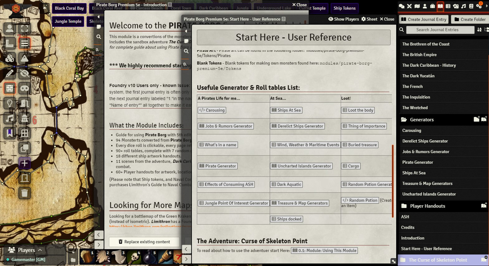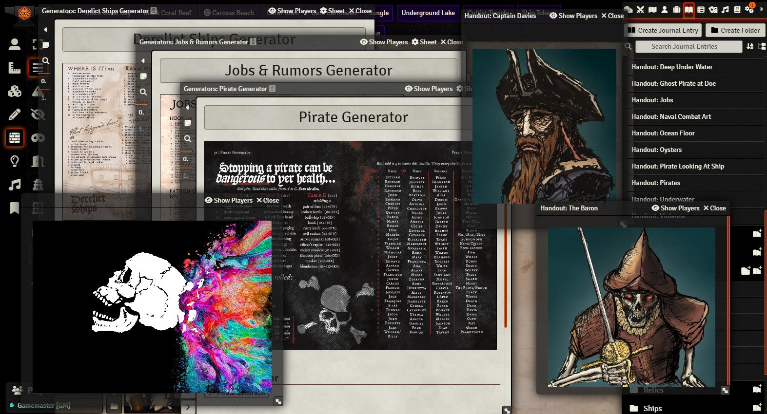 - 56 journal entries walking you through the Curse of Skeleton Point adventure, content generators, potions, equipment, and more