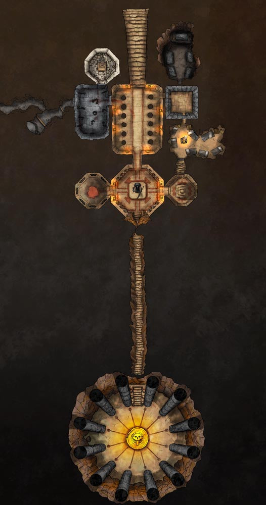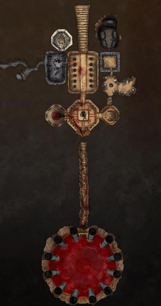 Continuing the Indiana Jones vibes, I present the 2nd level of the Jungle Temple in Pirate Borg, the Cultist Cave. You can connect this to the Jungle Temple via the large round door on the northern part of this map, or use it as a stand alone location!