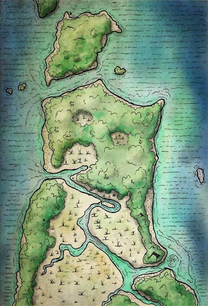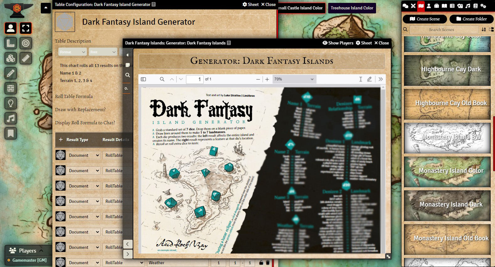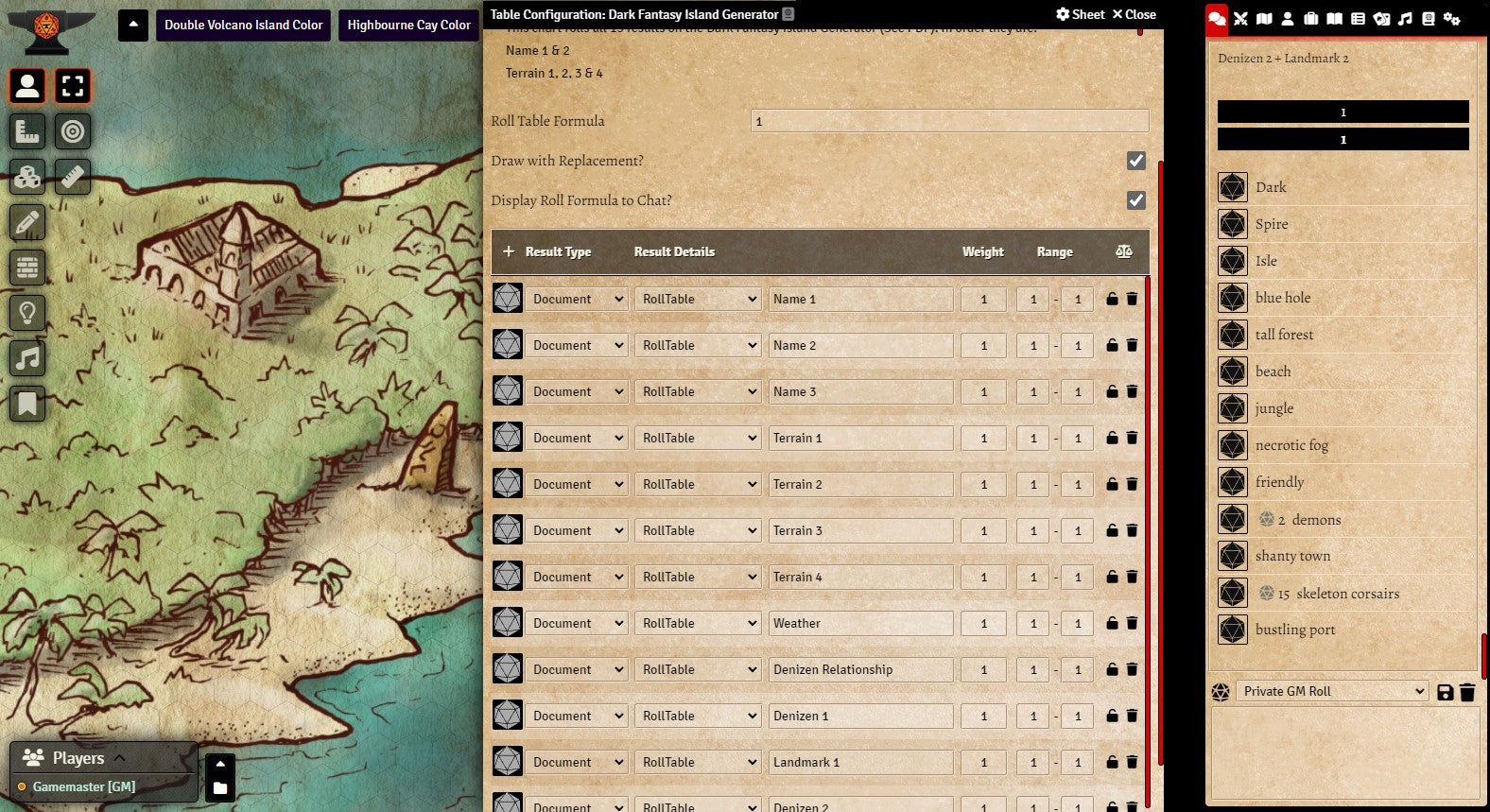v11. The Dark Fantasy Island Generator is presented in Foundry as a roll table to generate results in one click. Sound and lighting have been added to all maps that make sense to do so, and a hex grid scaled to best fit each illustration. Global lighting is on. Walls are being used for sound barriers only (large sound library included). Each map is also provided as a player handout.