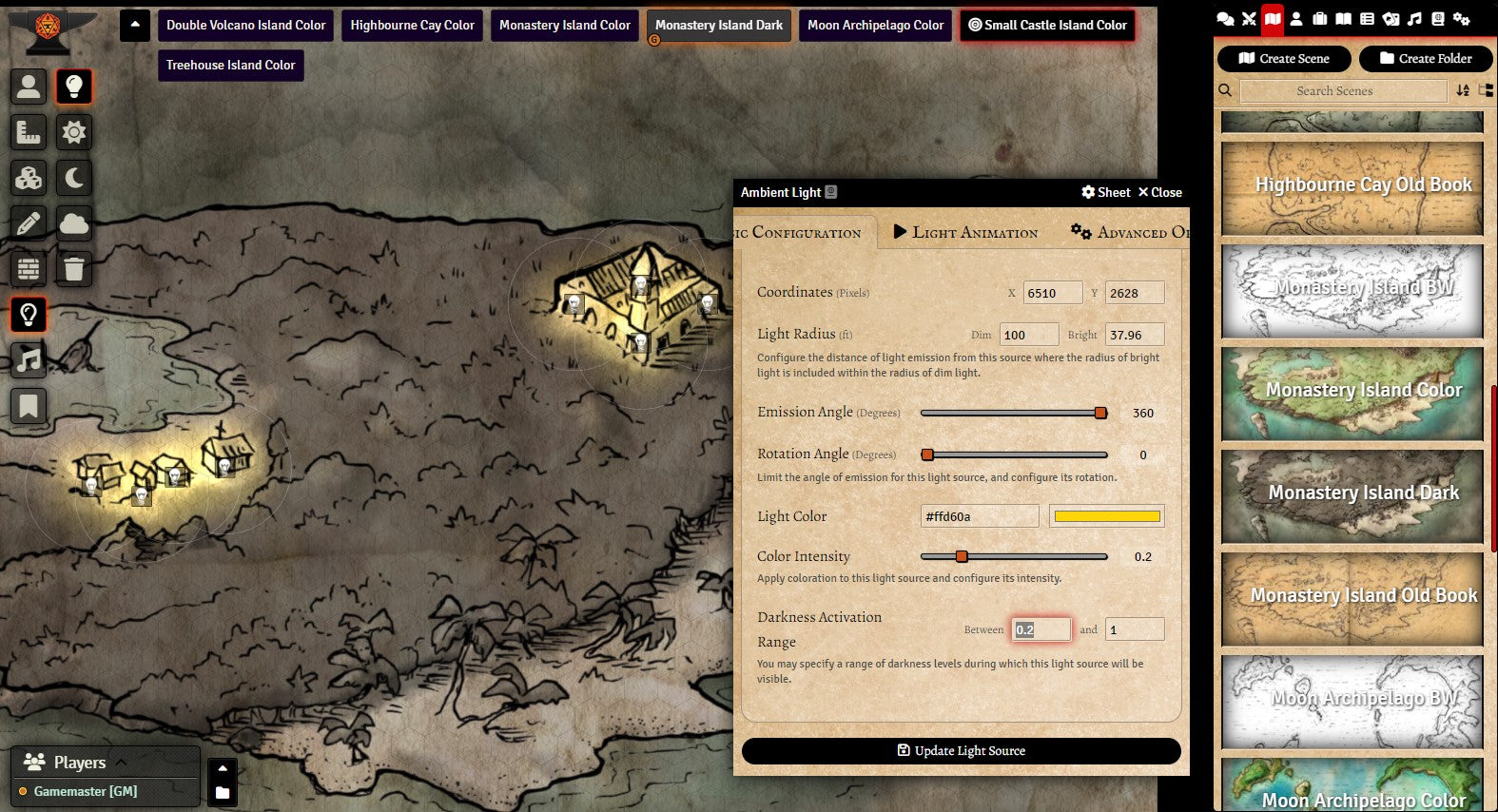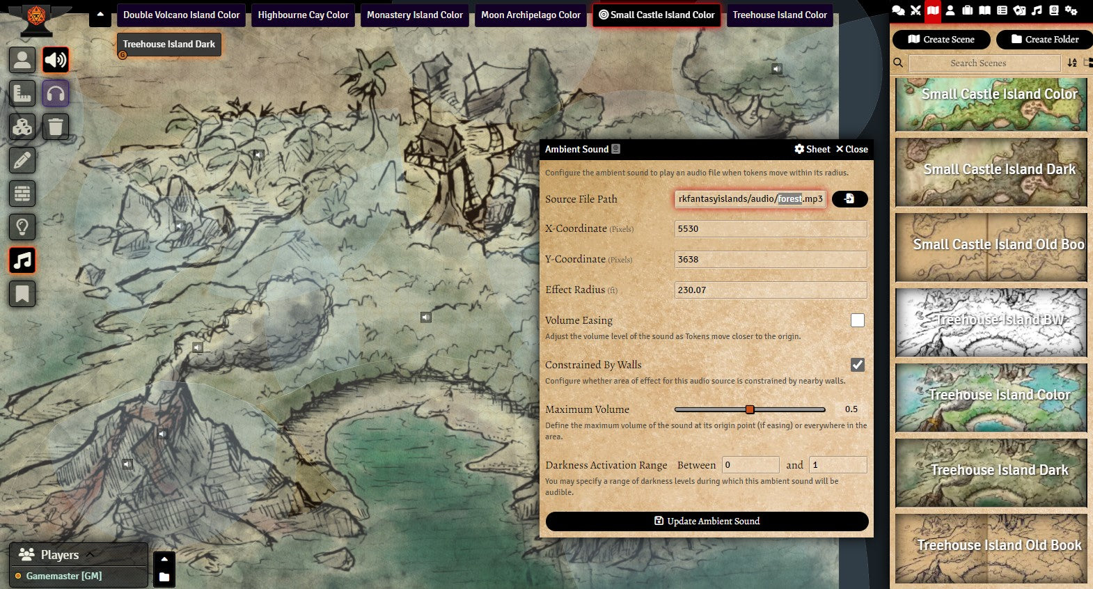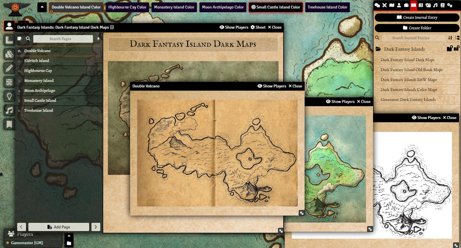 v11. The Dark Fantasy Island Generator is presented in Foundry as a roll table to generate results in one click. Sound and lighting have been added to all maps that make sense to do so, and a hex grid scaled to best fit each illustration. Global lighting is on. Walls are being used for sound barriers only (large sound library included). Each map is also provided as a player handout.