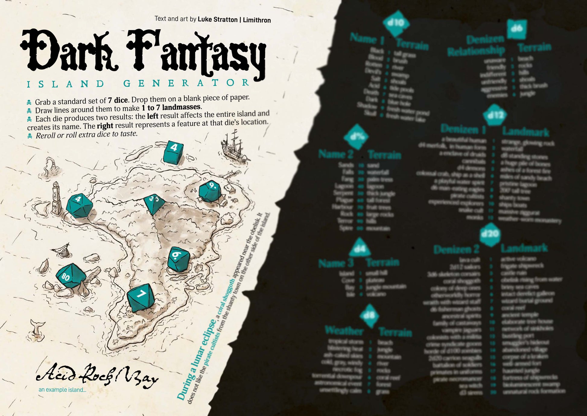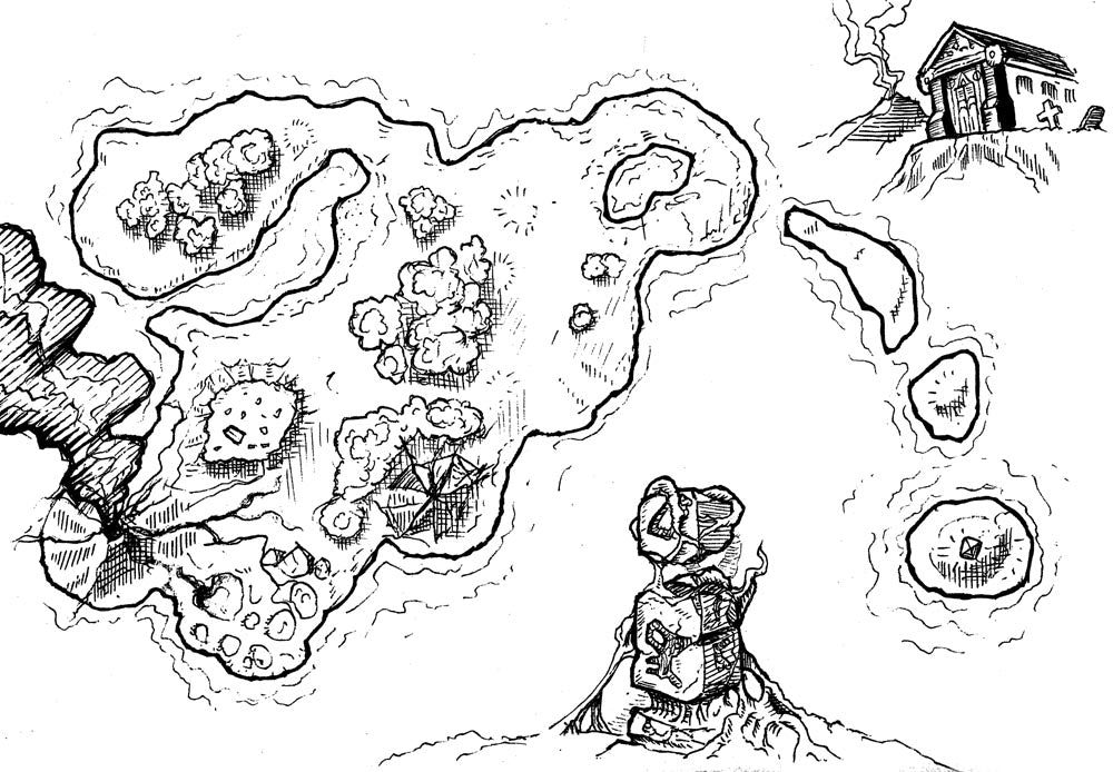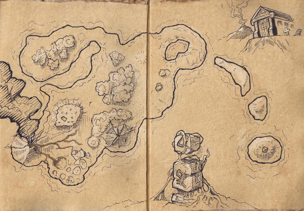 I made this really fun Dark Fantasy Island Generator, where you drop a bunch of dice on a piece of paper, track it with a pencil, and it makes an island, complete with landmarks, denizens, and even a name. Over the course of the year, I carried around a little sketch book, and when it was slow at the convention booth, I'd draw stuff in it.