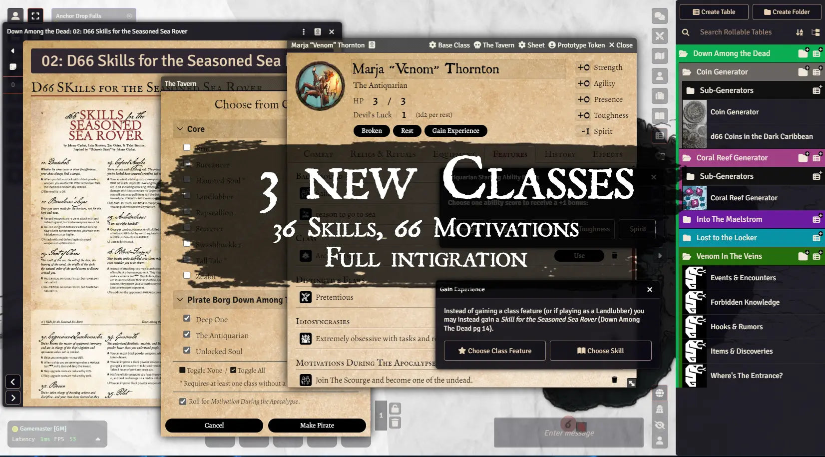 - 3 Character Classes, with journals entries and "Tavern" Integration.
