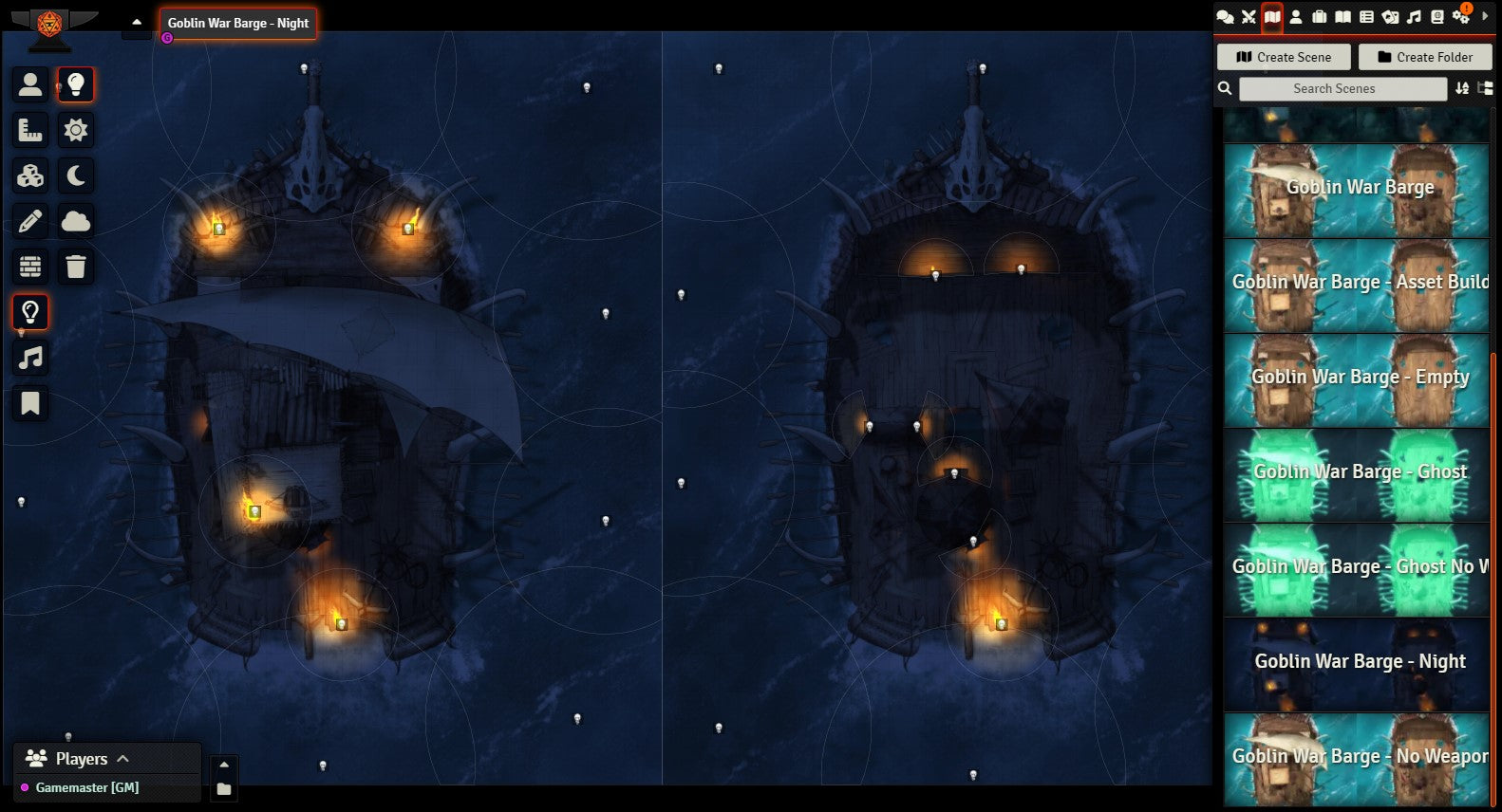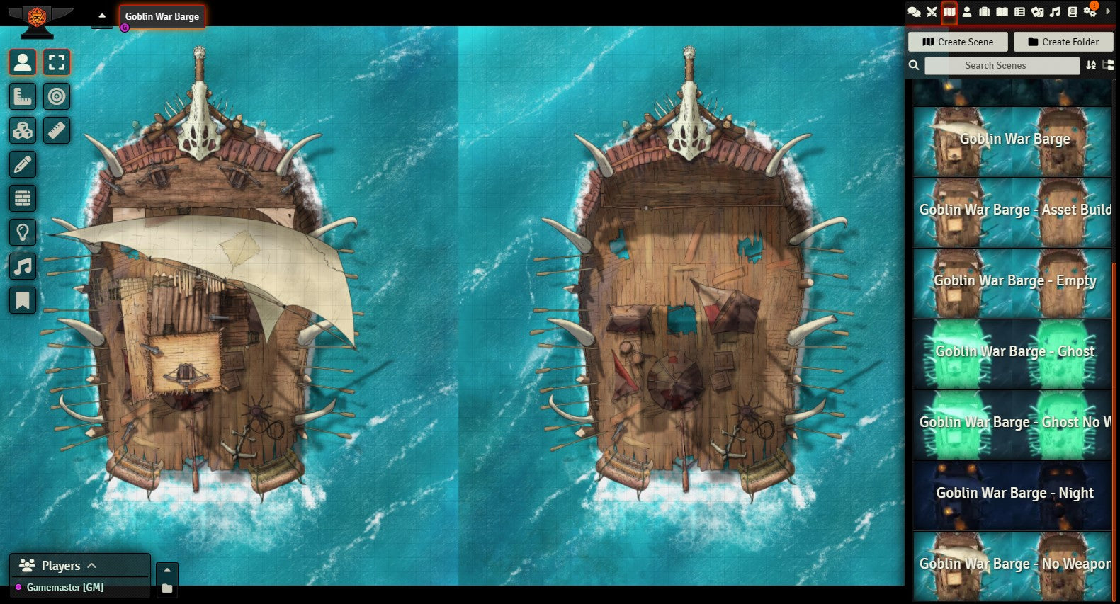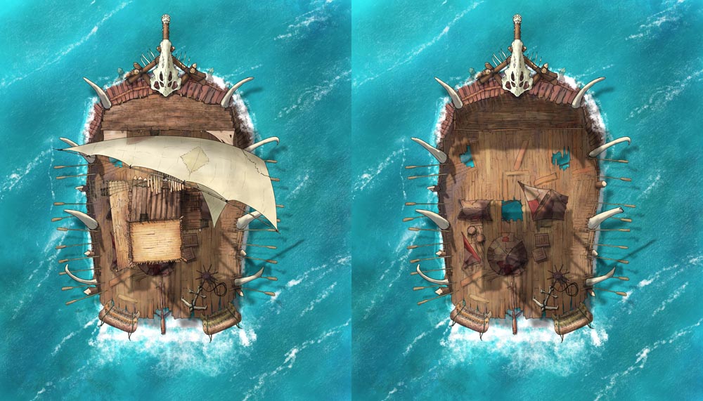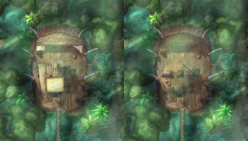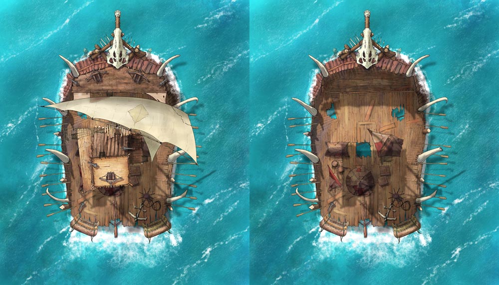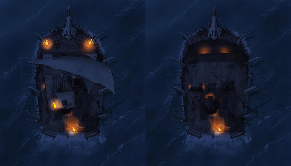 After many moons of the sketch living on my hard drive, I finally present the Goblin War Barge map set. Of course you can use this as a skeleton or pirate raft, but I love imagining a horde of orcs or goblins crowding the deck: screaming, hooting, and hollering, a seething mass of frenzied teeth, claws, and hatred. As a GM, what's not to love about that?
