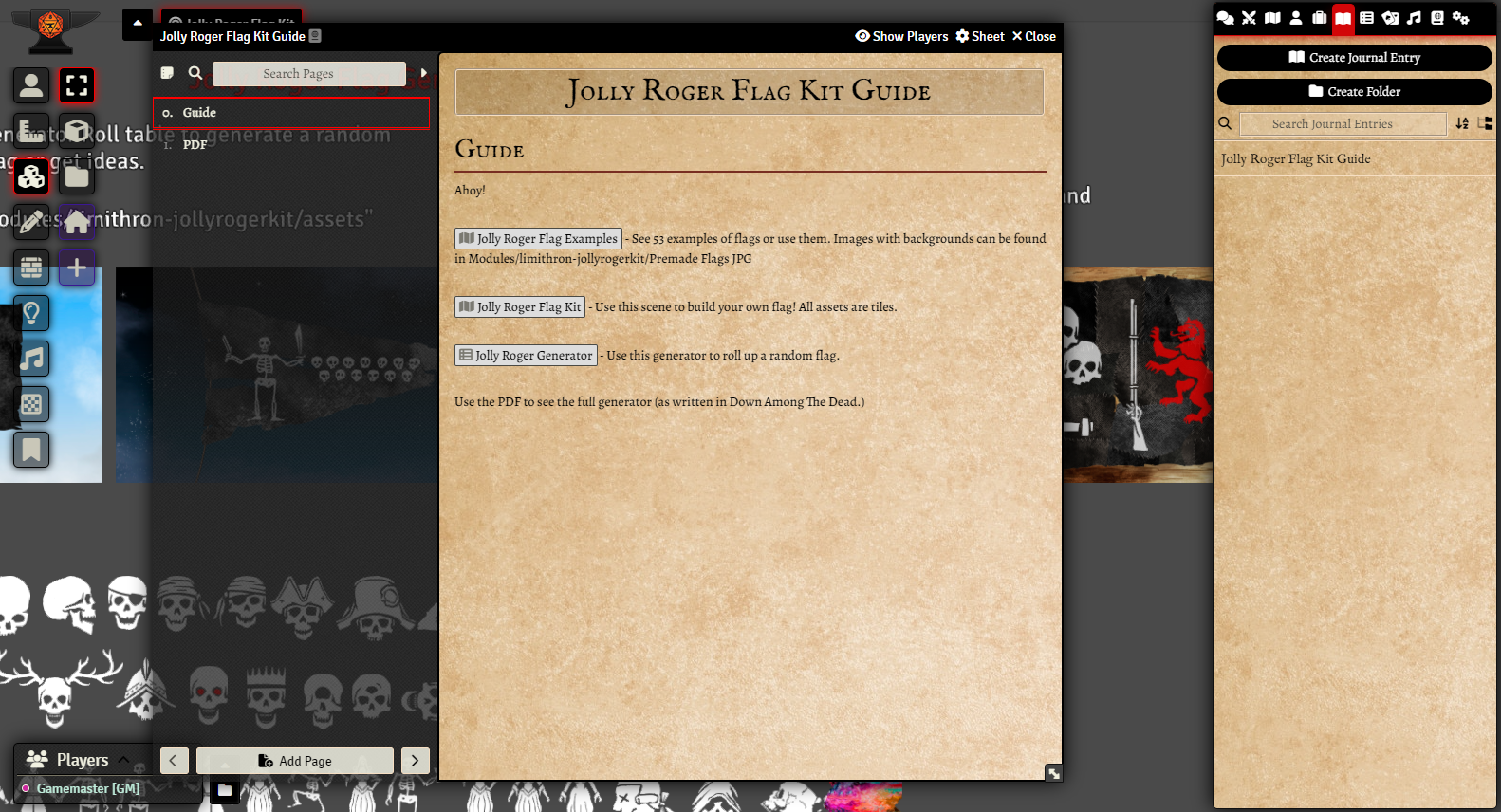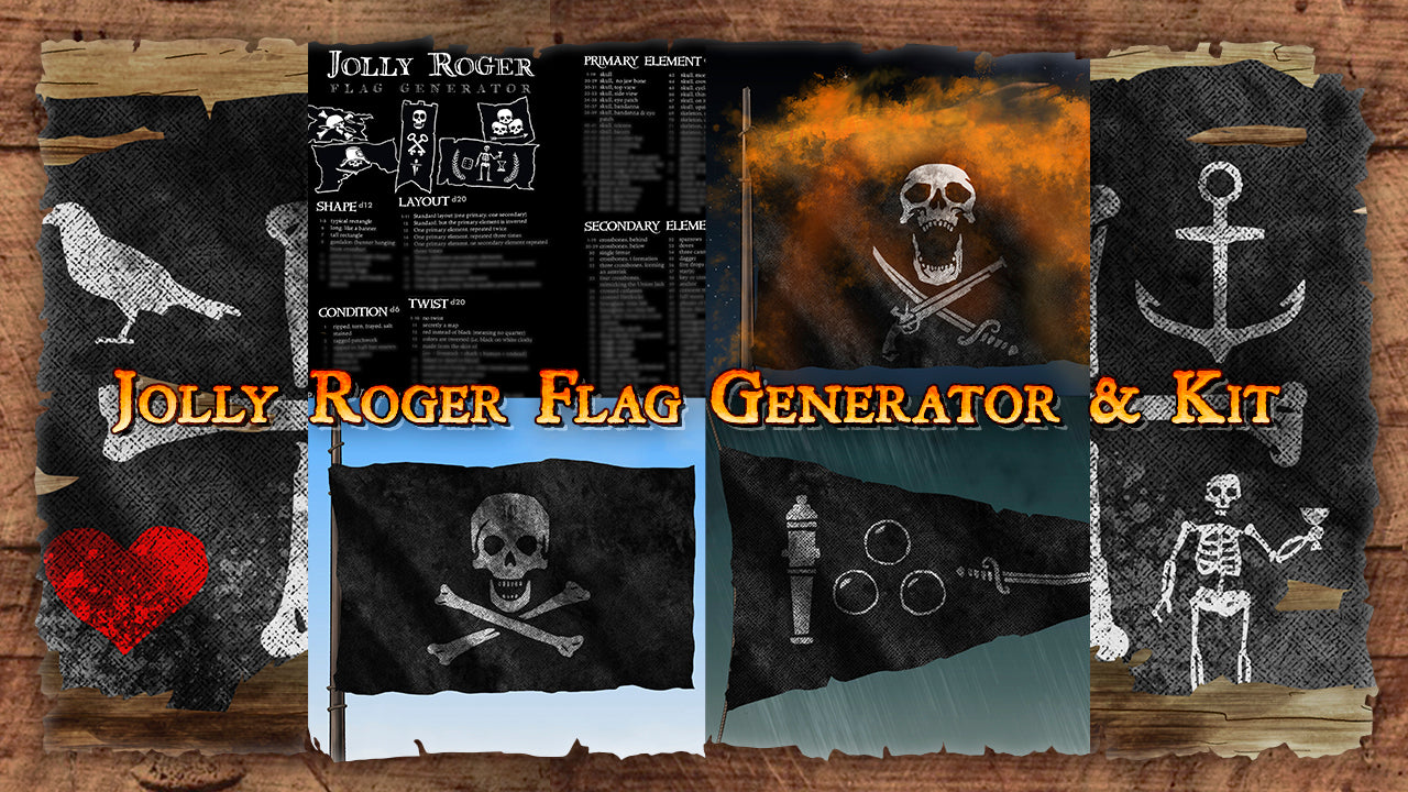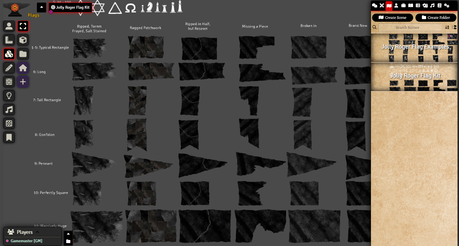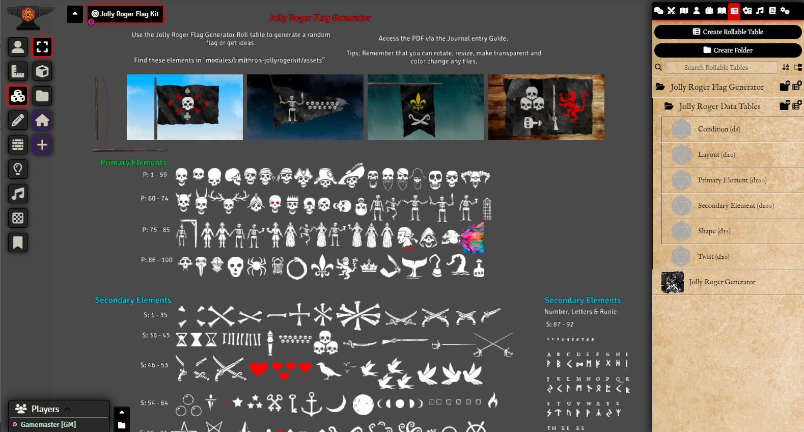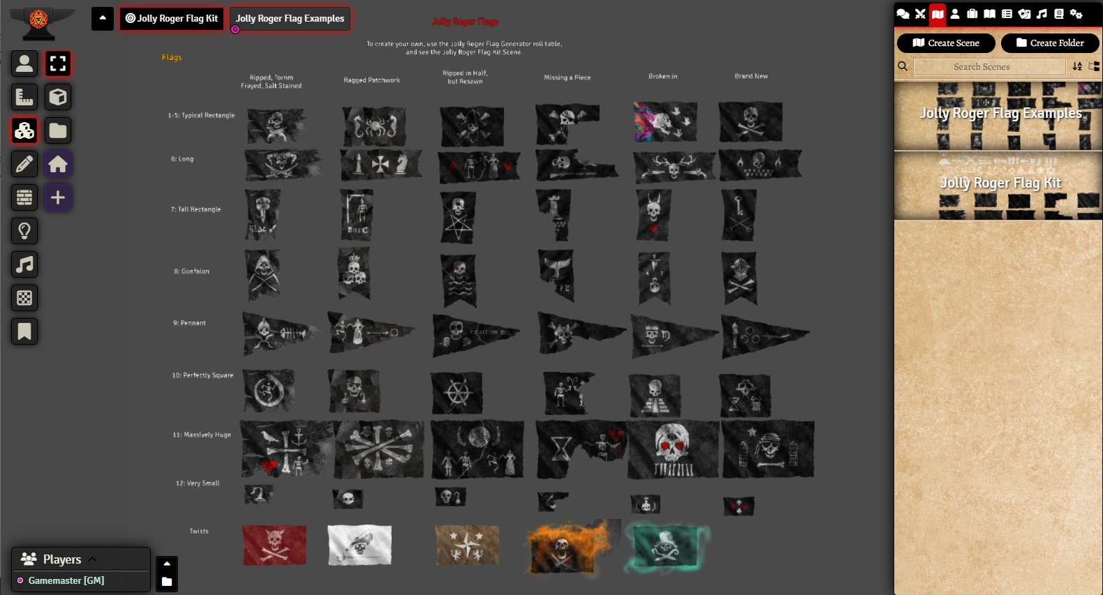 V12 - This is an adventure to make sure everything is imported. Use the roll table "Jolly Roger Generator" to roll a complete flag at once. It includes icons in the roll table. All elements are tiles and can be used to build a flag right inside of Foundry.