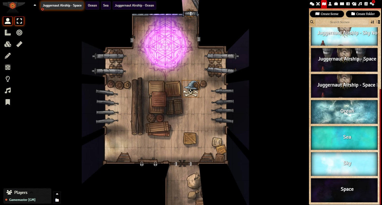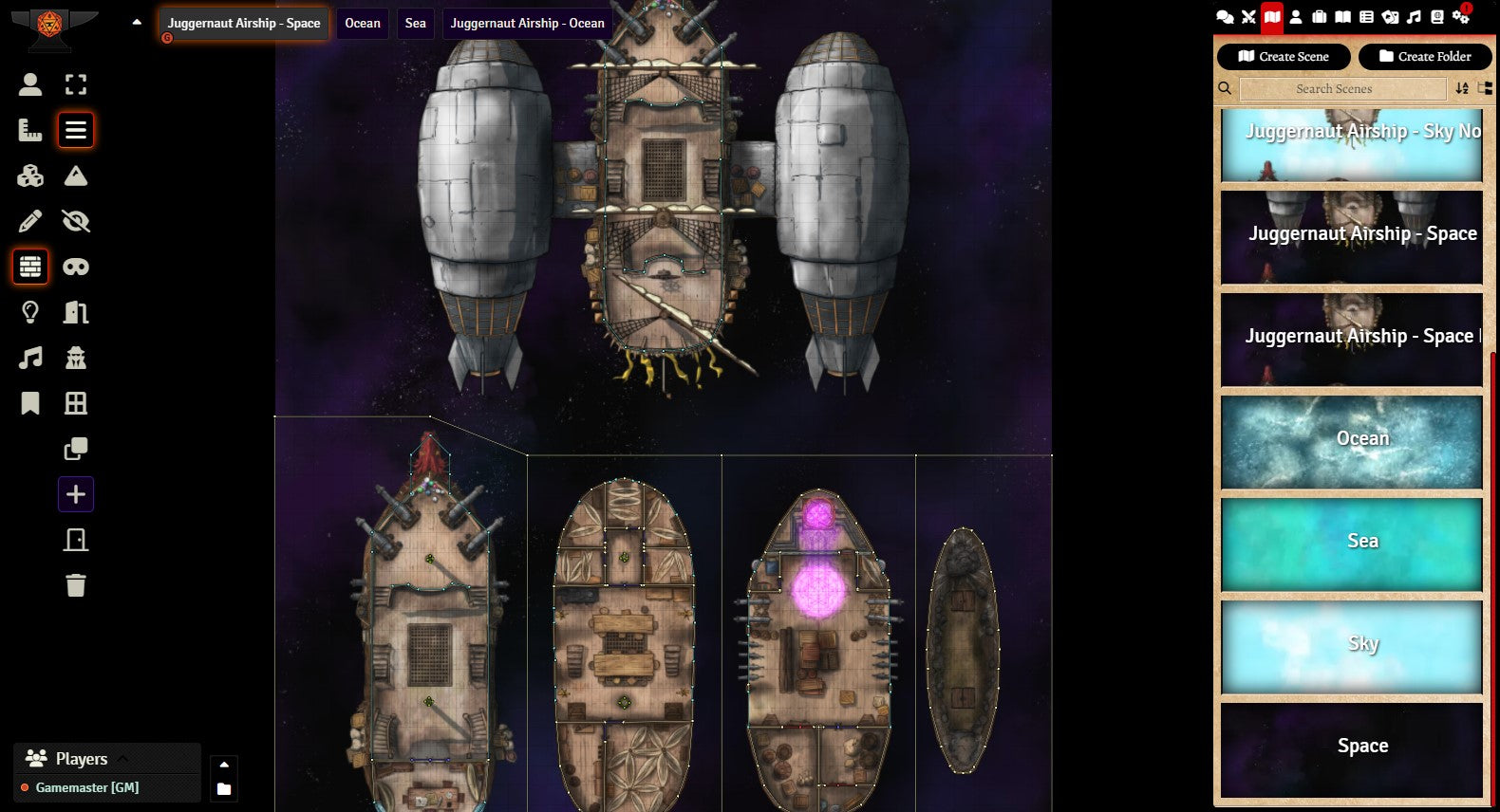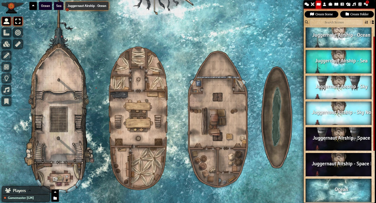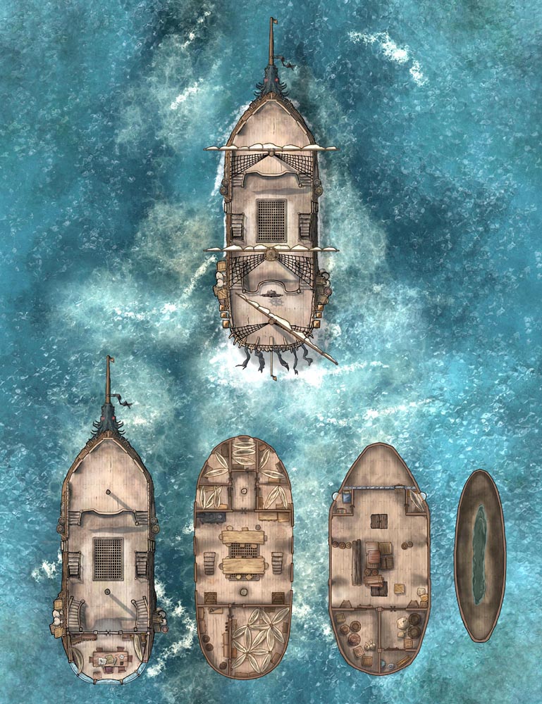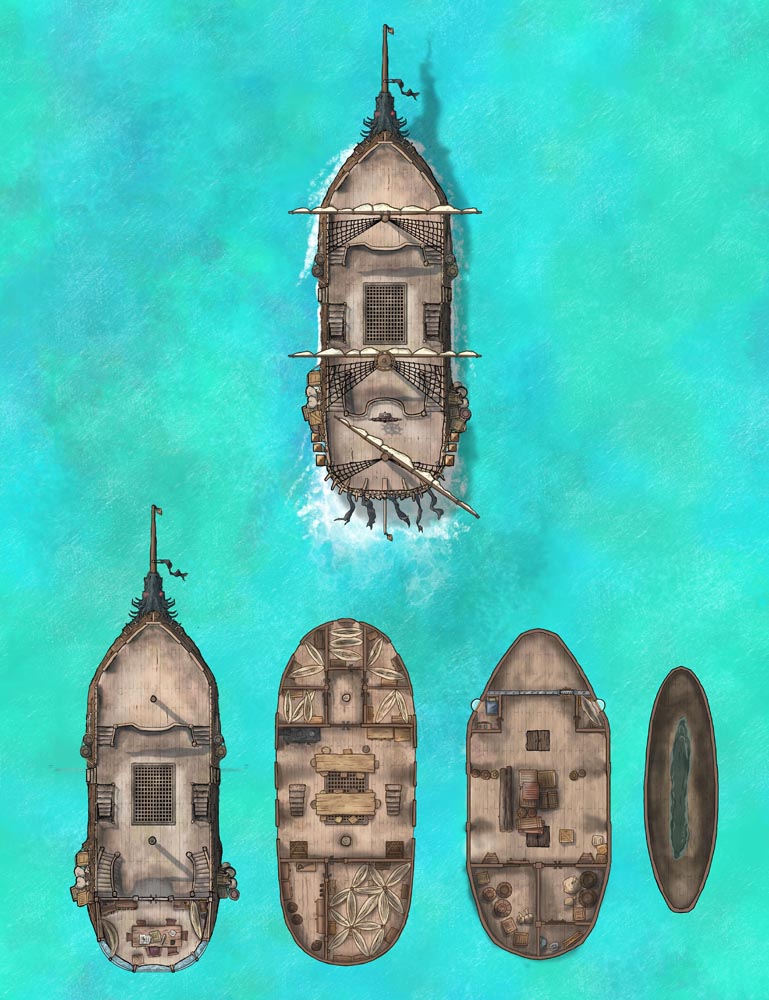 Whether you sail The Juggernaut through the seas, the air, or the cold of deep space, the included variations have you covered. Six hi-res JPEG files map out every deck of the ship, in various settings. The set also includes 13 transparent PNG files to drop onto any map, and 4 seamless background files.