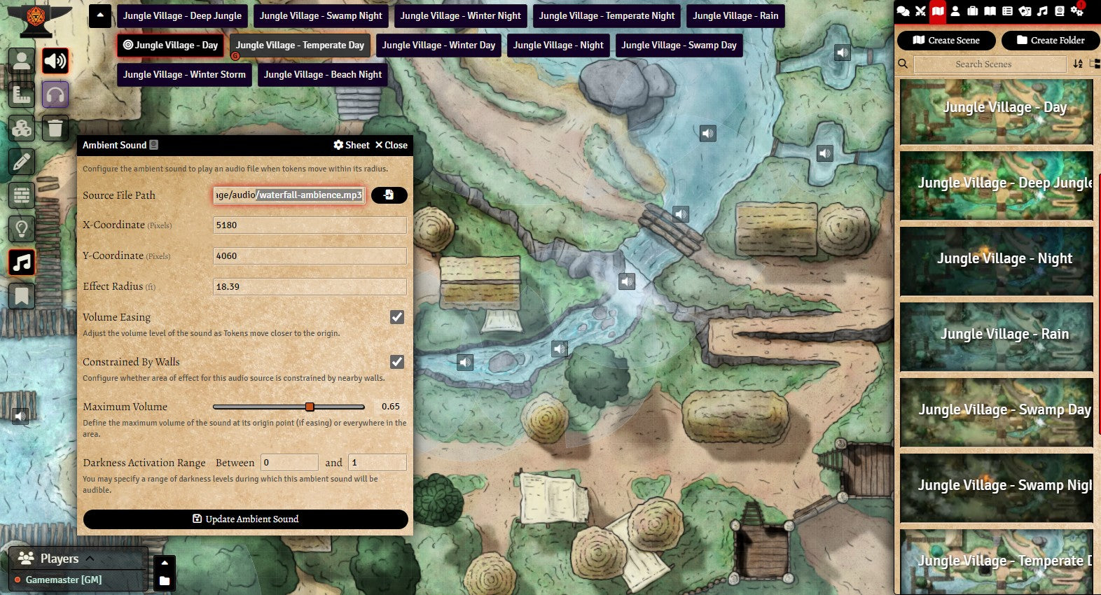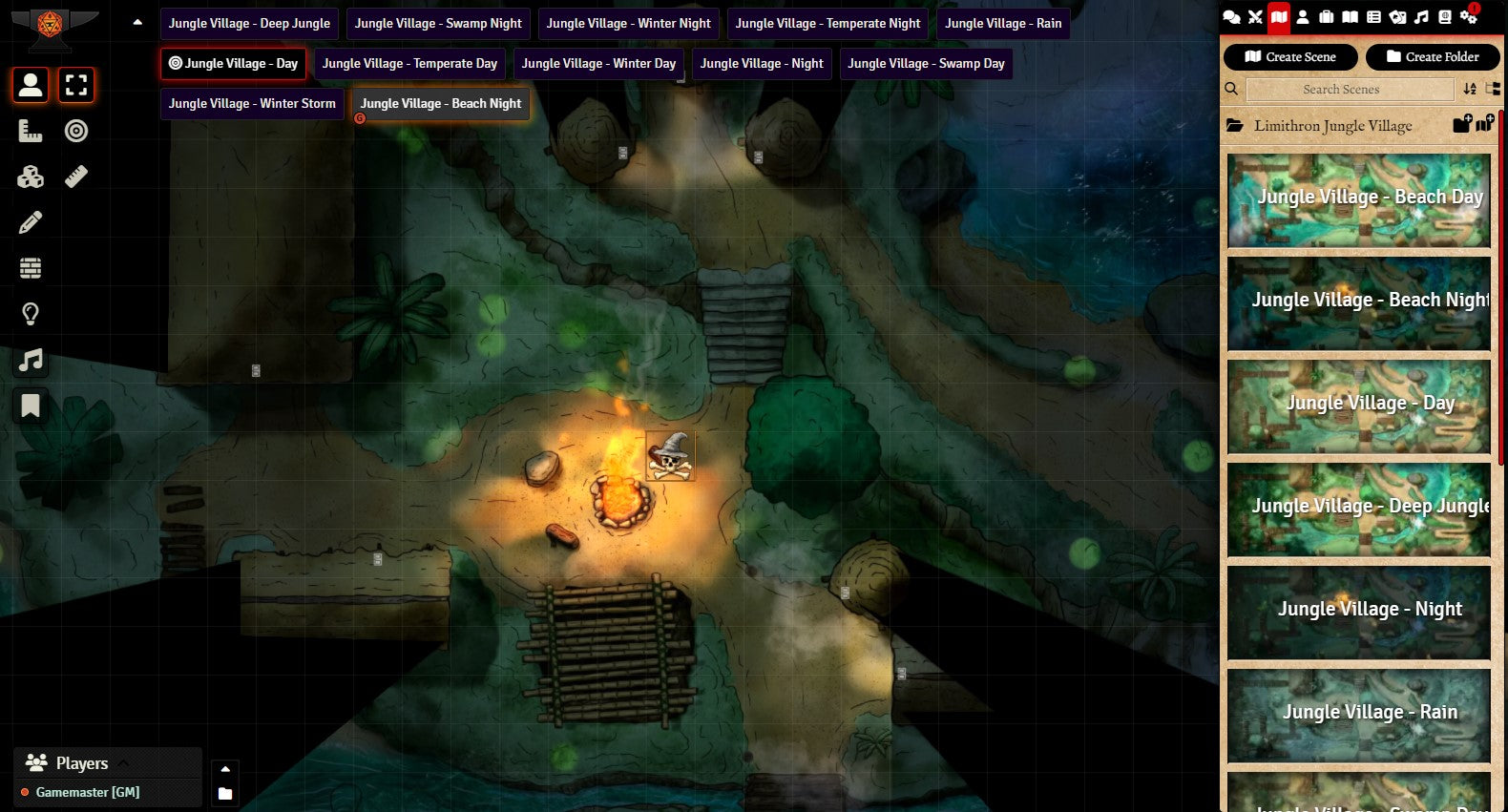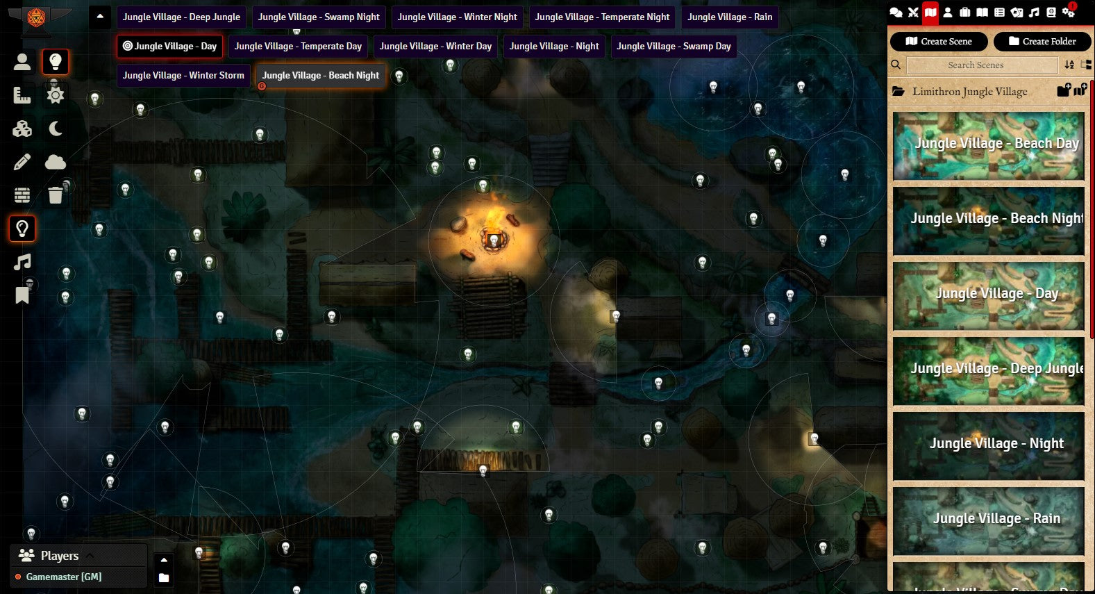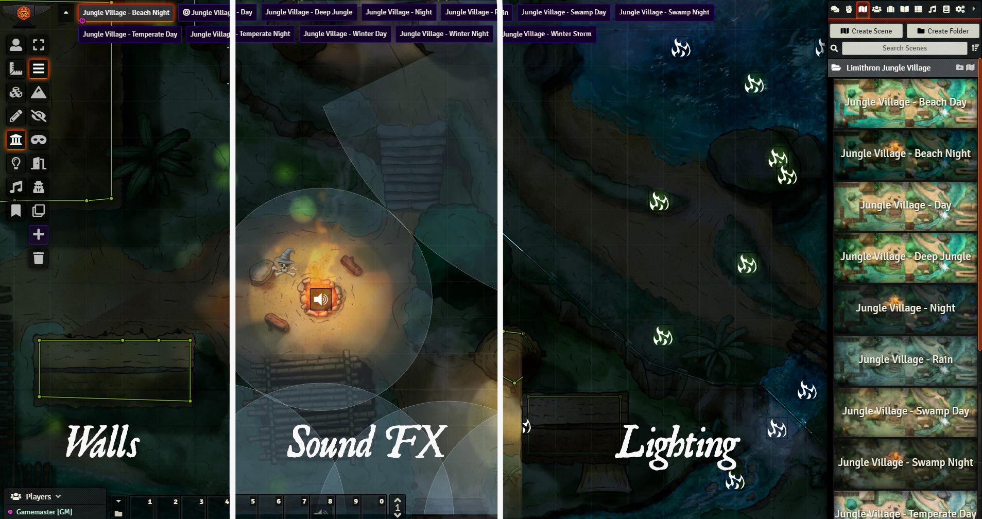 v11. The Foundry VTT Module is ready-to-use and includes walls, effects lighting (campfire, torches, fireflies, fog, water), and sound effects (water, jungle, campfire, rain).