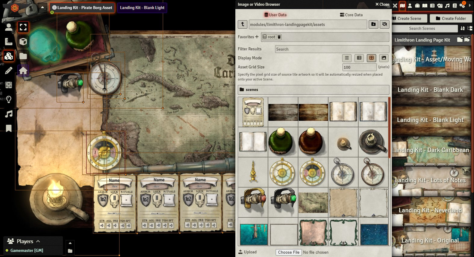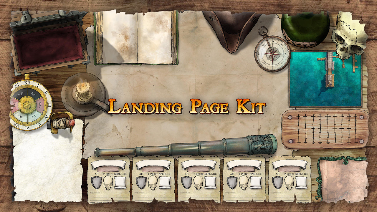 Between VTT battles, your players should have something on the screen to enhance the gaming experience – and keep them focused. So I created this Landing Page Kit to customize your virtual tabletop game's perfect starting point. With 6 pre-made page versions and over 40 drag & drop assets, you'll be fully equipped to set up your game's base of operations, and track game details with it as well.