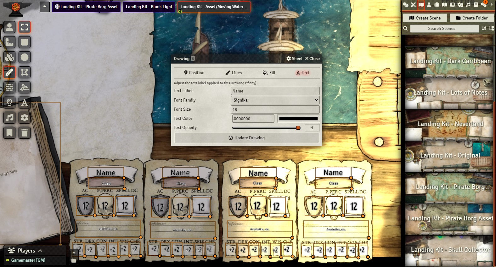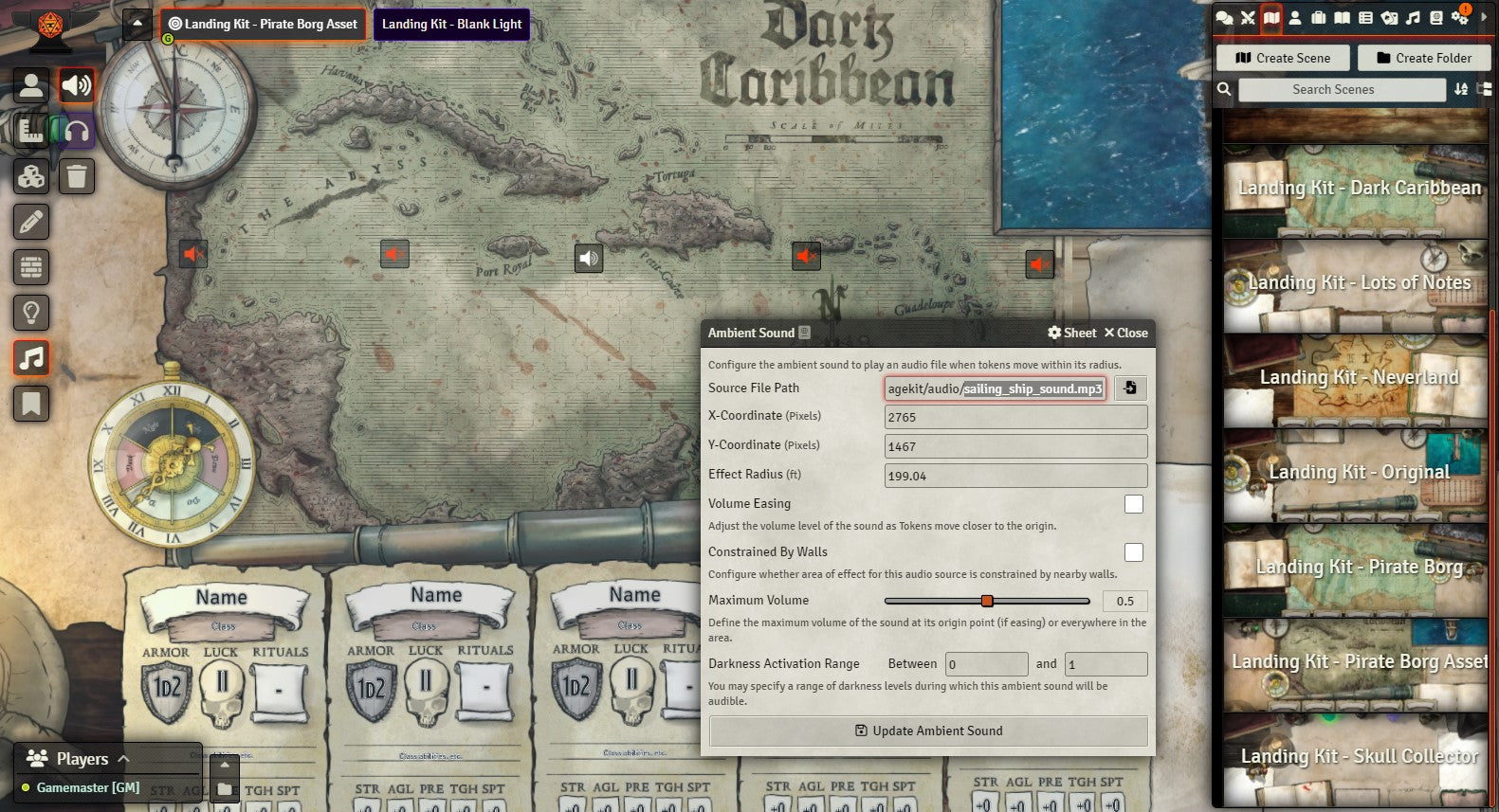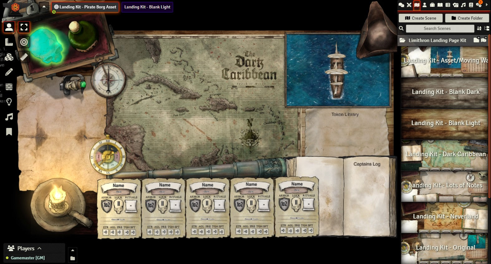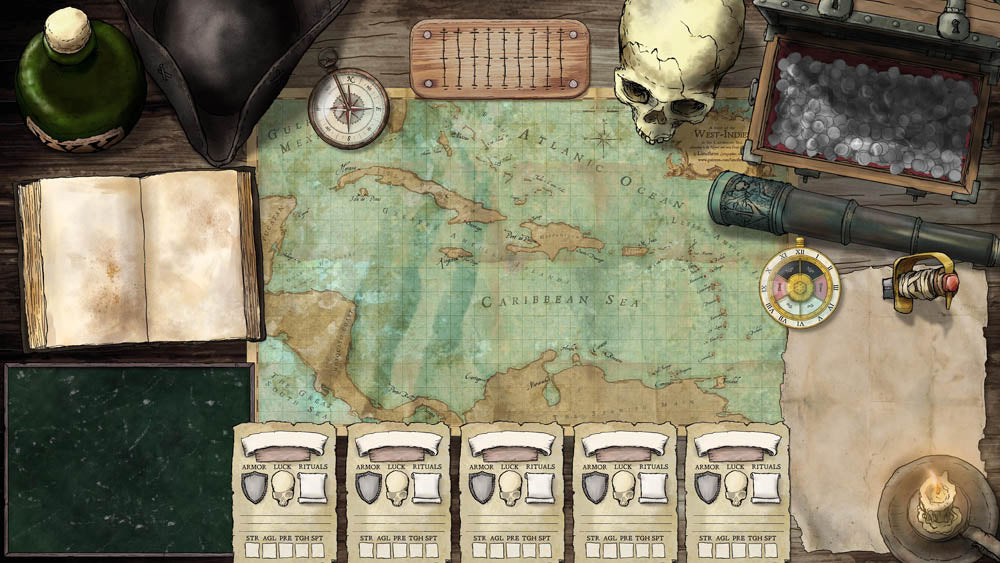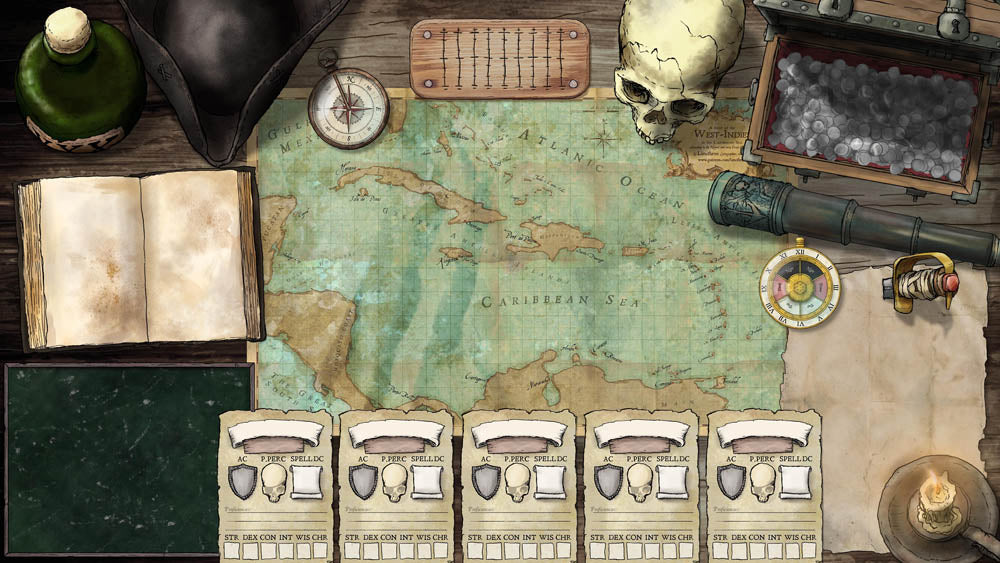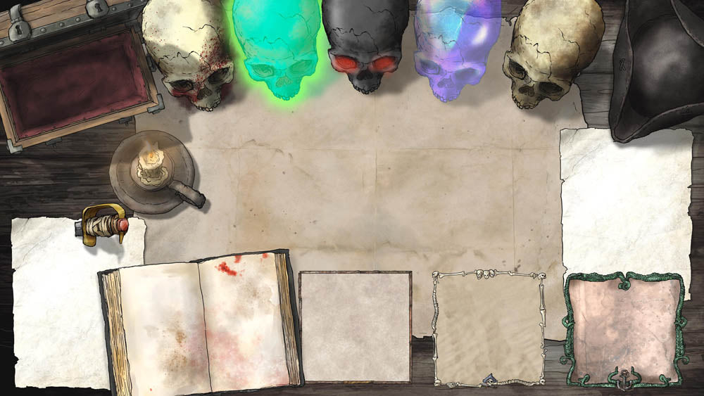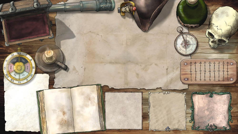 v11 - Comes with 8 Scenes with lighting, text boxes and available mood sound effects. Updated 11/6/23 added Pirate Borg style page with current Dark Caribbean map and character cards, and mood sound FX. Tile Scroll used for animating water effect.