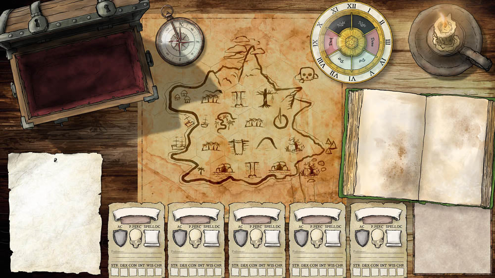 - Paper, notes, books, and blank maps. There is a blank map with the inside cut out so you can overlay it on one of you own maps and match the style.