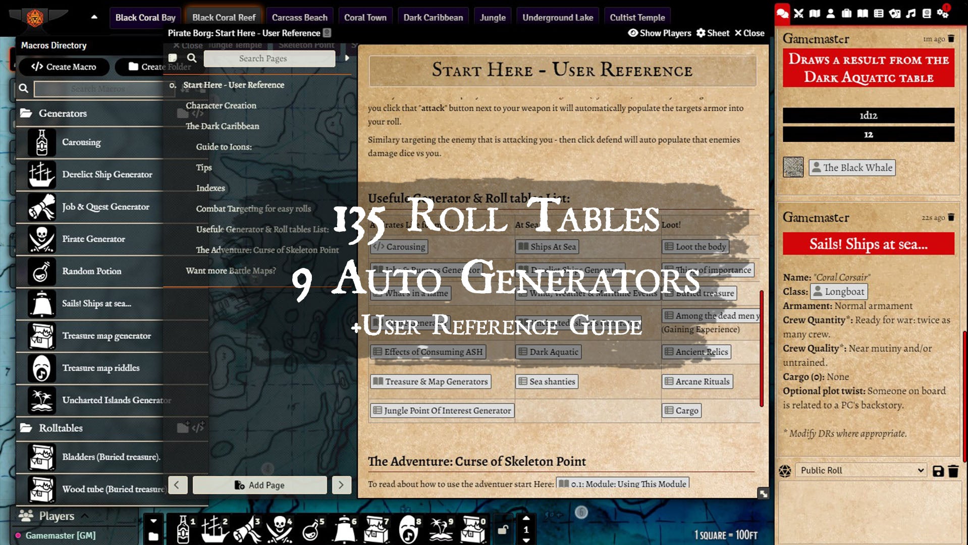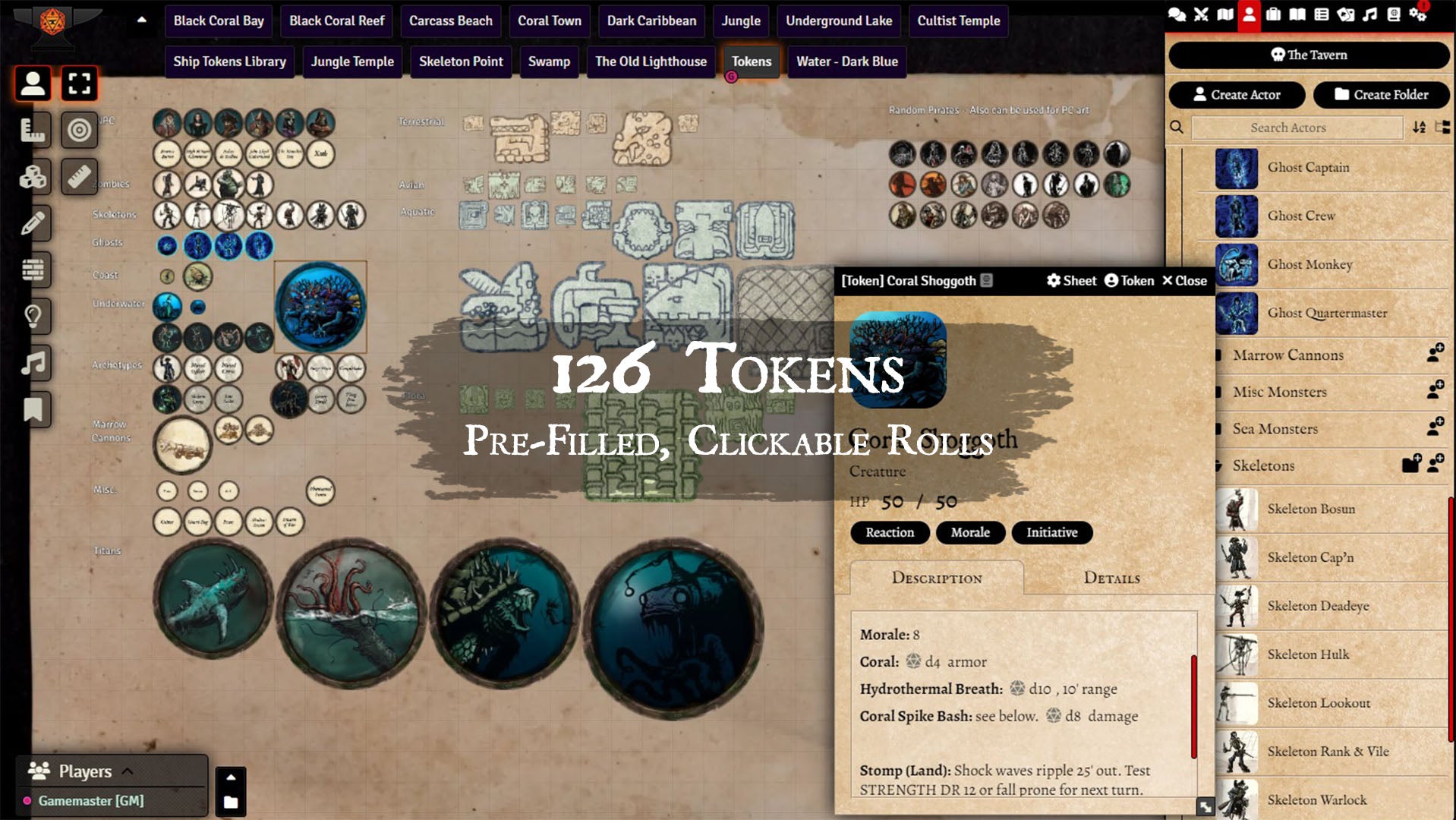 - 100+ tokens for monsters, NPCs, random pirates, and ships for naval combat.