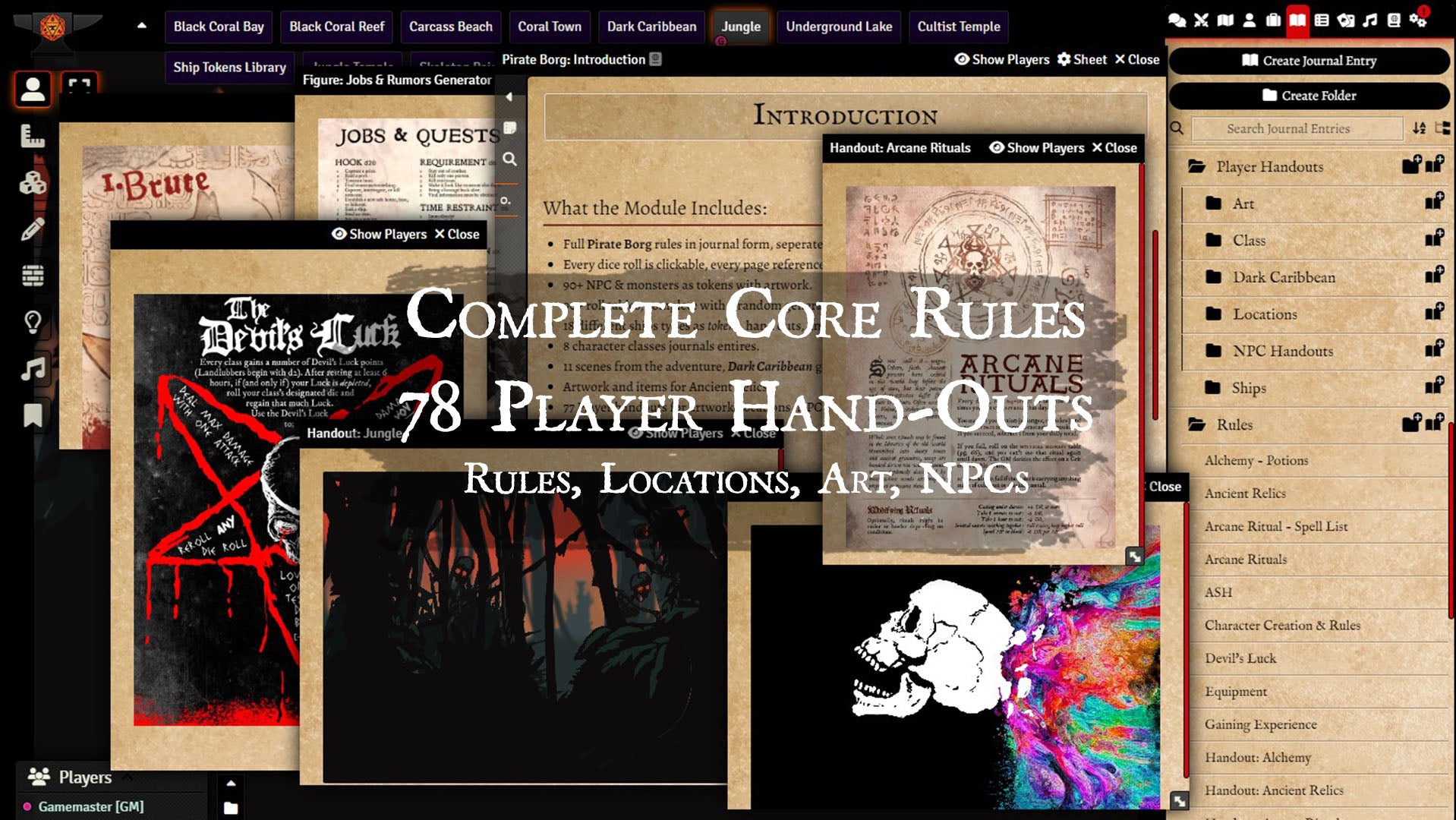 Classes, weapons, roll tables, NPC and monster actors, ship actors, and scenes. The adventure as well as all of the core sections of the book are setup as journals, and the digital maps and asset pack scenes are configured with walls and lighting.