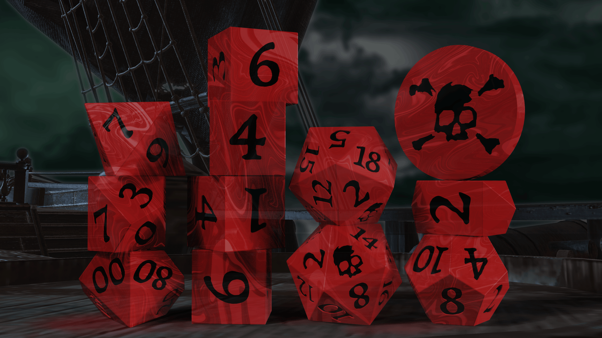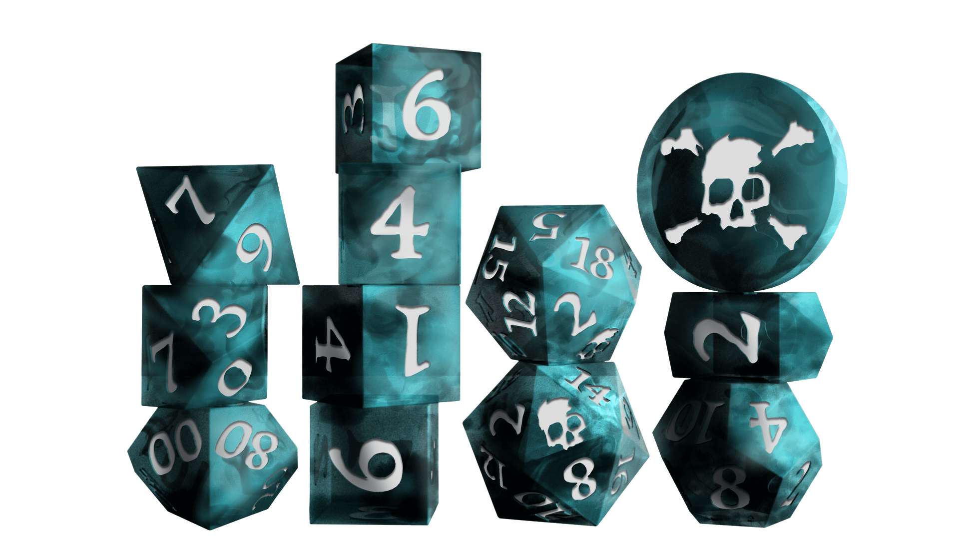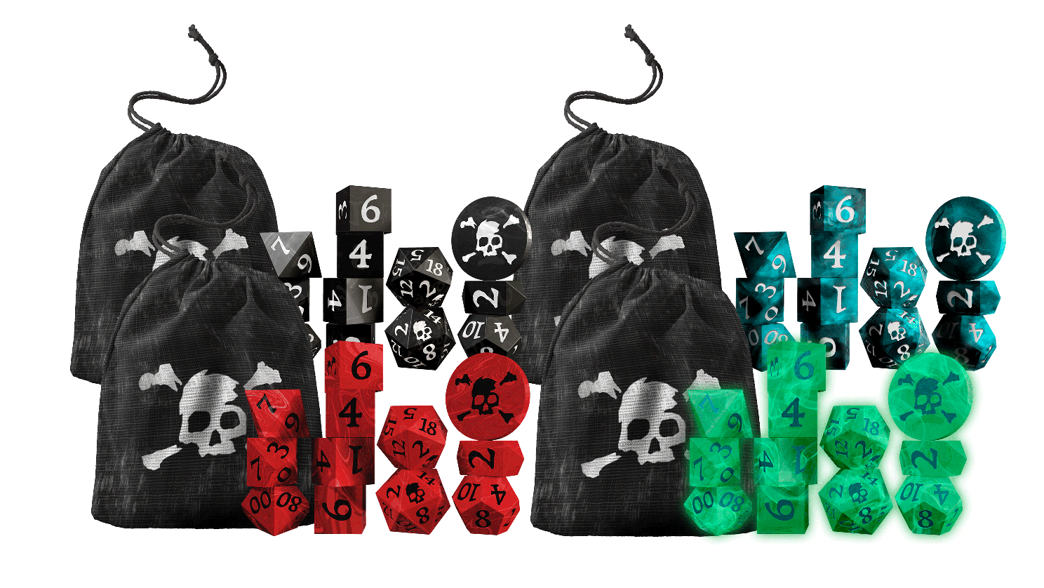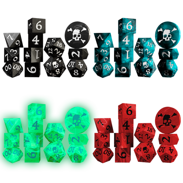 A 12-pack of inked resin dice! The pack features (1) d2 acrylic coin, (1) custom-shaped d4, (4) d6s, (1) d8, (1) d10, (1) d%, (1) d12, and (2) d20s. Each dice set includes a cloth bag imprinted with the skull & crossbones. Choose between the murky swirled cyan & white inked "Dark Caribbean", the brooding swirled black & white inked "Jolly Roger", the bloodthirsty swirled red & black inked "No Quarter", or the glow-in-the-dark green & dark green inked "Ship of the Dead"!