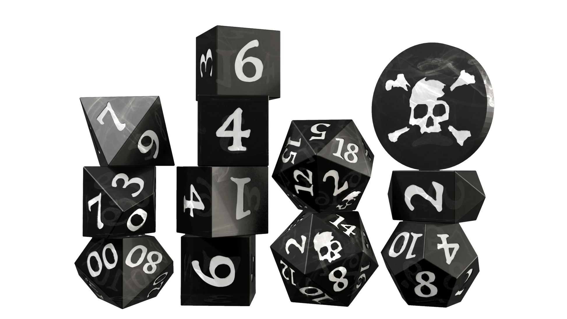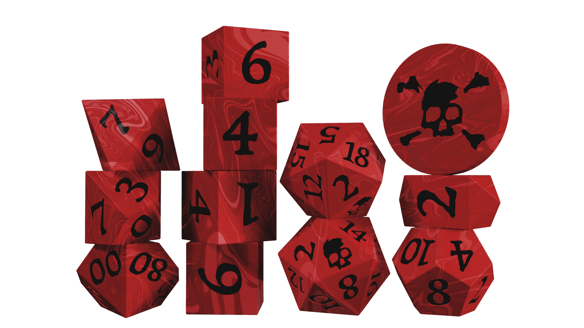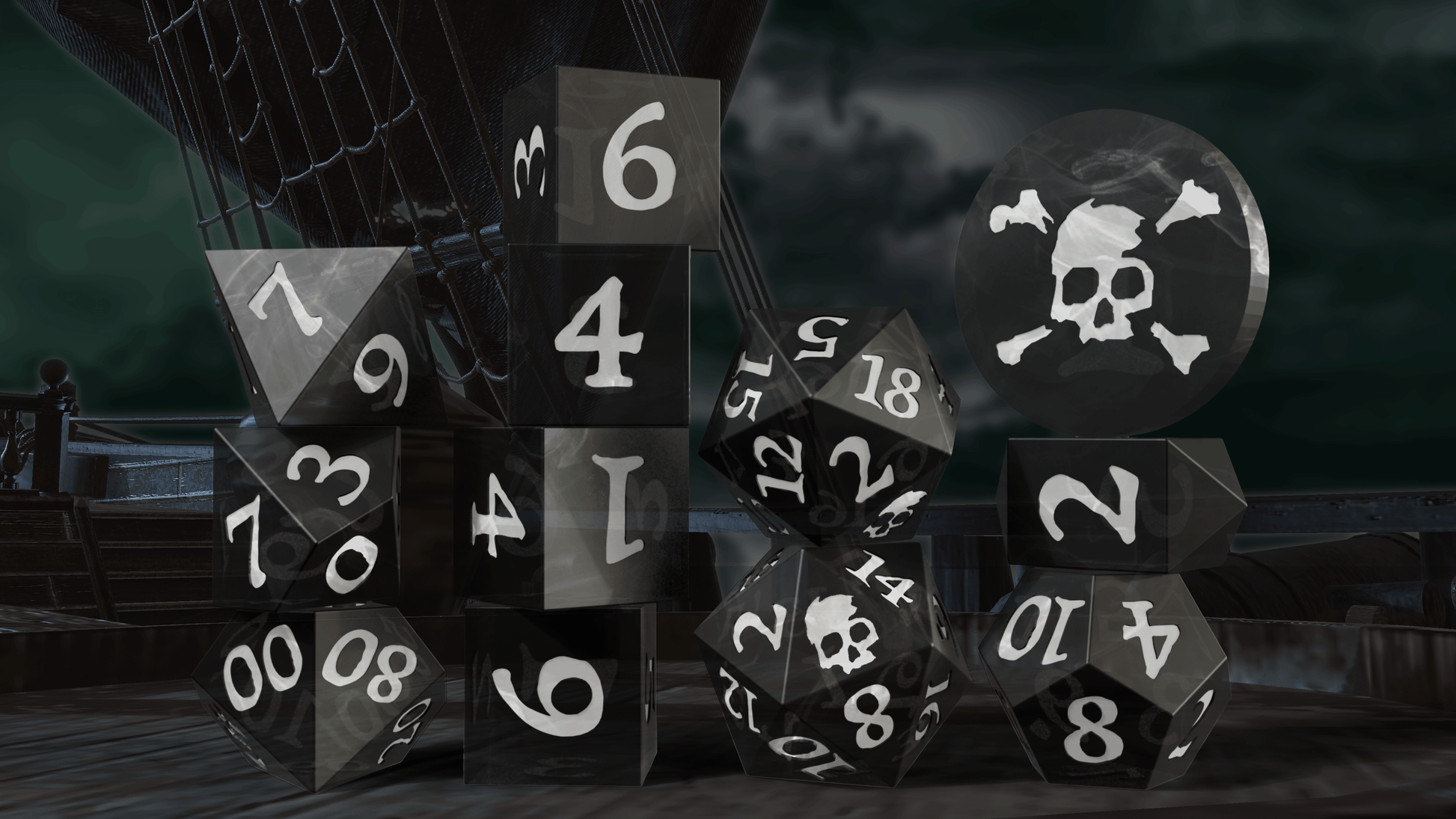 A 12-pack of inked resin dice! The pack features (1) d2 acrylic coin, (1) custom-shaped d4, (4) d6s, (1) d8, (1) d10, (1) d%, (1) d12, and (2) d20s. Each dice set includes a cloth bag imprinted with the skull & crossbones. Choose between the murky swirled cyan & white inked "Dark Caribbean", the brooding swirled black & white inked "Jolly Roger", the bloodthirsty swirled red & black inked "No Quarter", or the glow-in-the-dark green & dark green inked "Ship of the Dead"!