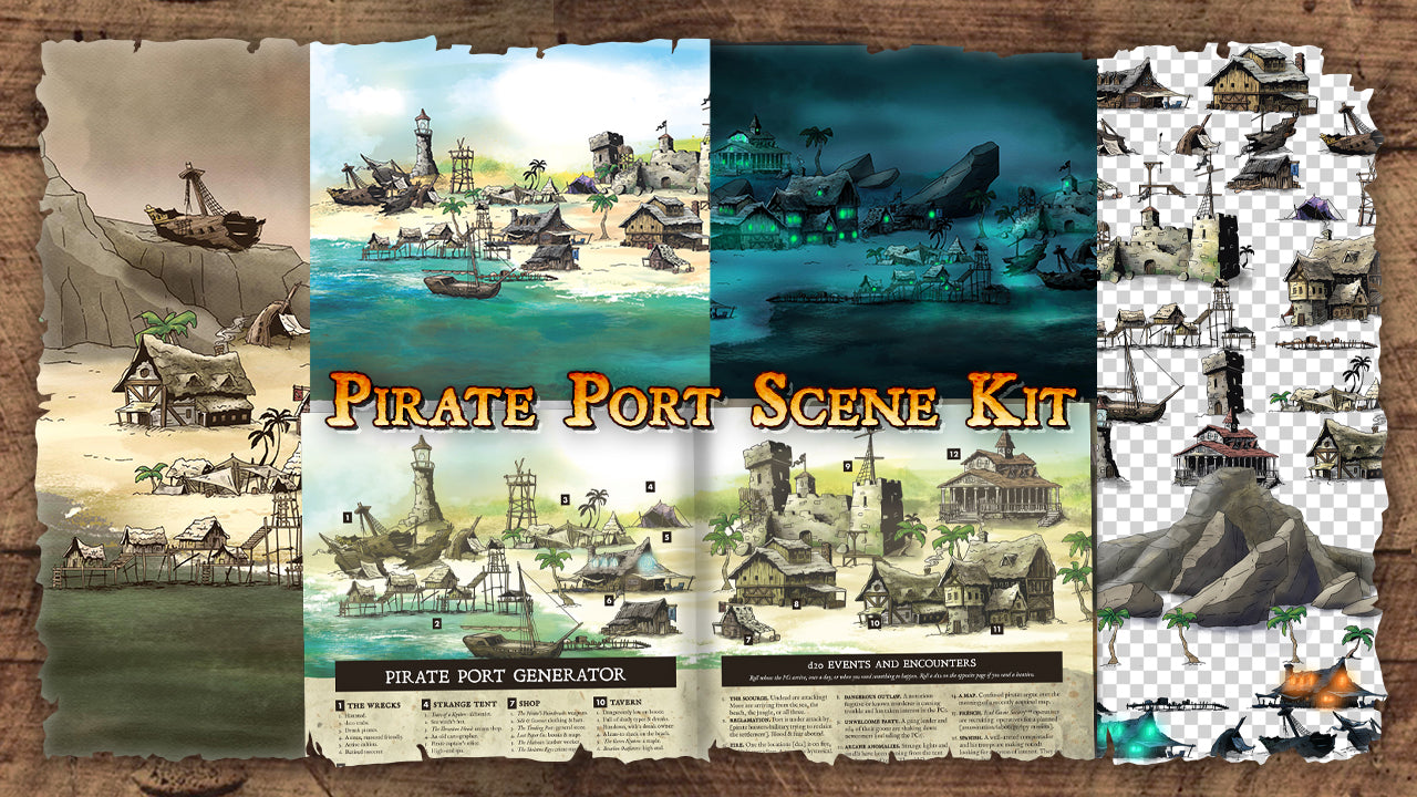 The Pirate Port Generator is one of five port themes that will be in my setting book, The Dark Caribbean (coming to Kickstarter in 2025). All five generators will have asset kits like this, so you’ll be able to craft an infinite number of drag-and-drop port scenes, and then generate details about them with a few dice rolls. Perfect for theater-of-the-mind style VTT game sessions, these scenes will let your players visualize the setting in more vivid detail, bringing your version of a pirate-run harbor to life.
