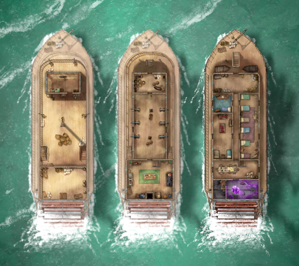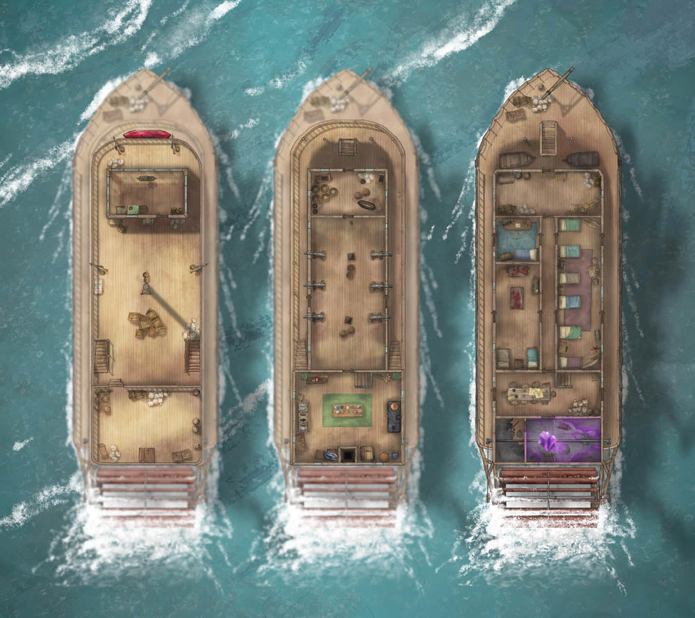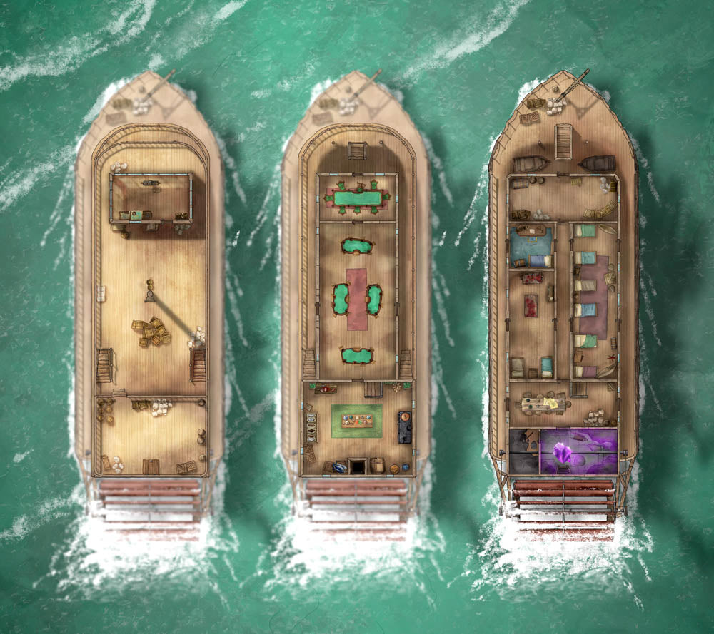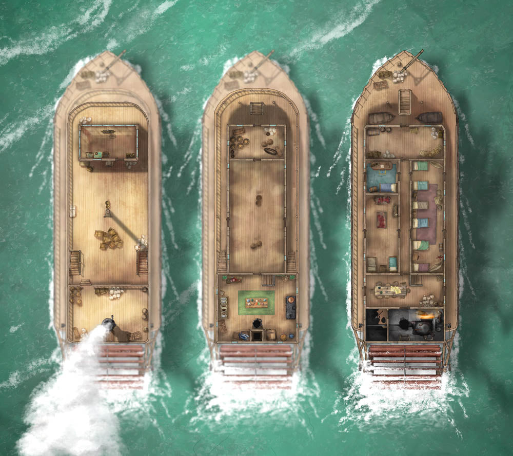 Each Riverboat map includes all ship decks for each variation. This set includes the original Riverboat, Steam Powered, Crystal Powered, the Riverboat Casino, and more – nine variations in all, as hi-res JPEG files. I’ve also created 14 PNG deck assets of the different ship sections to customize or recombine as needed, plus the steam column and more.