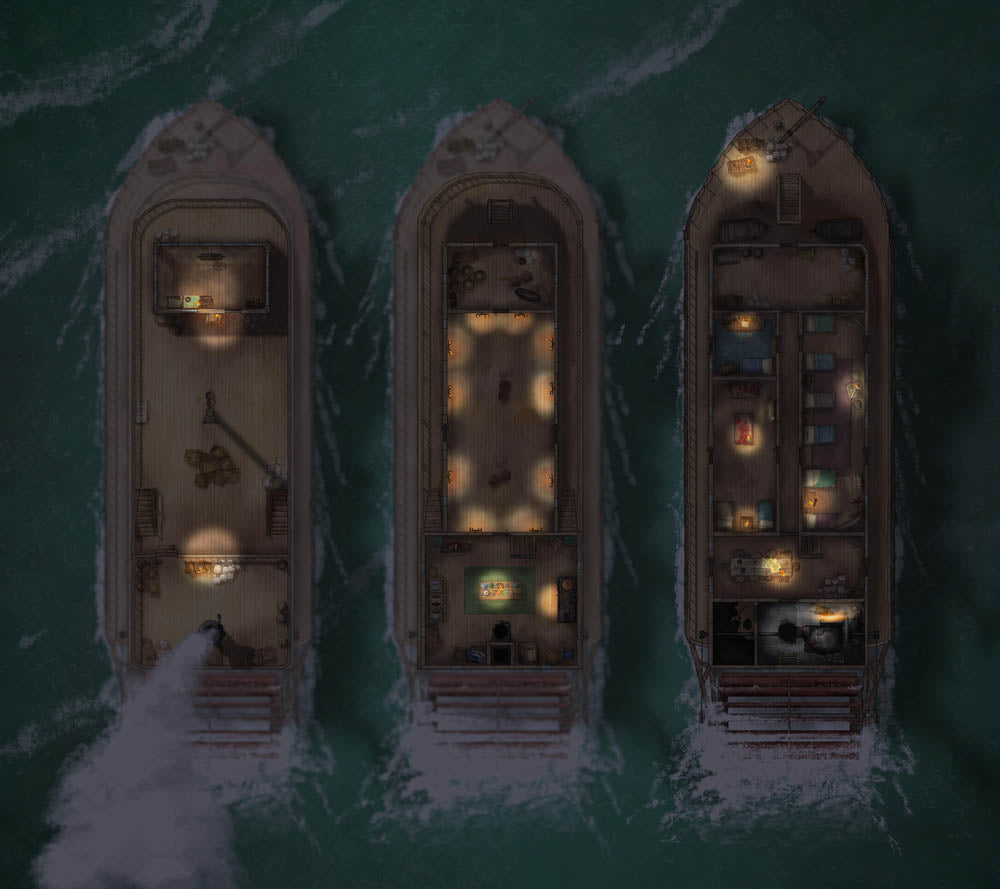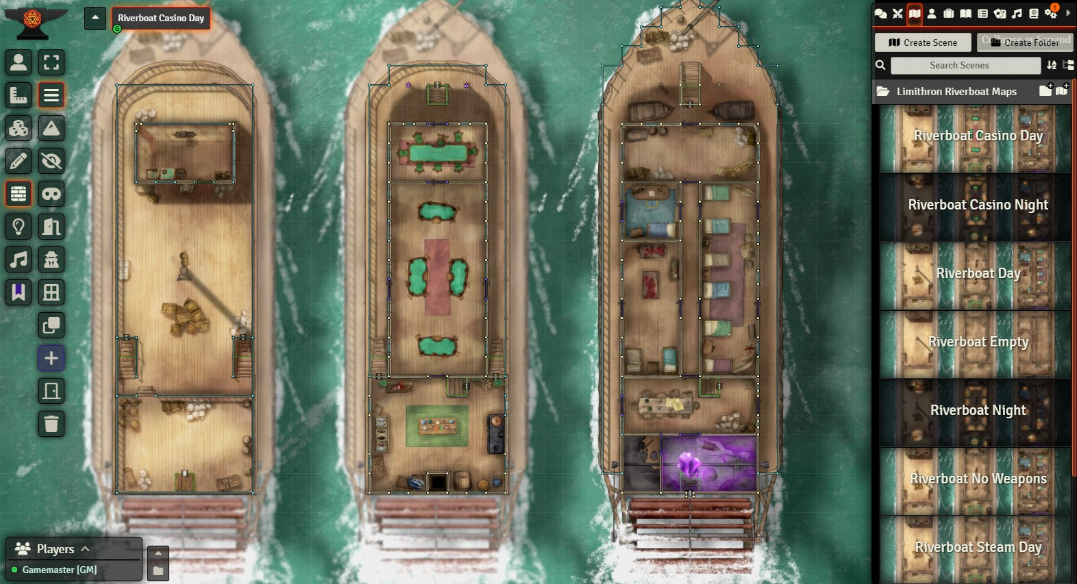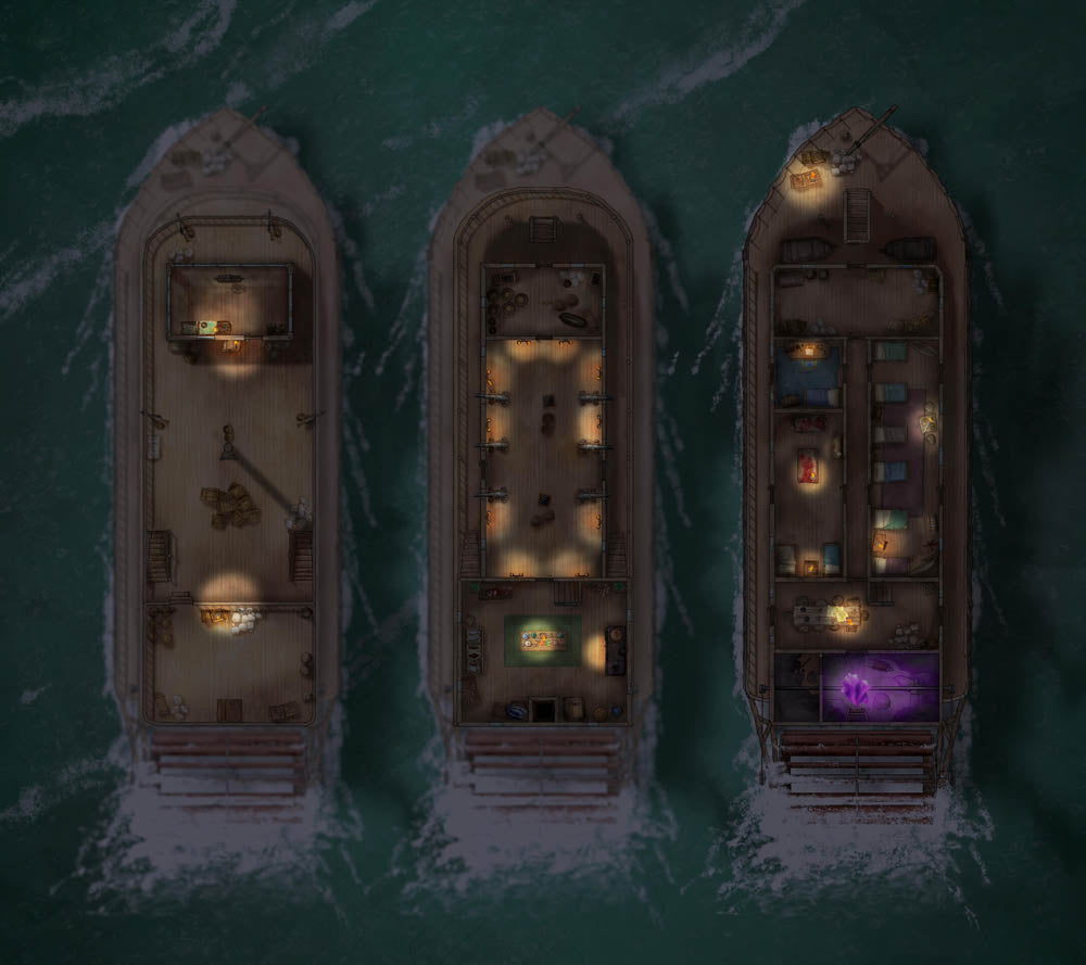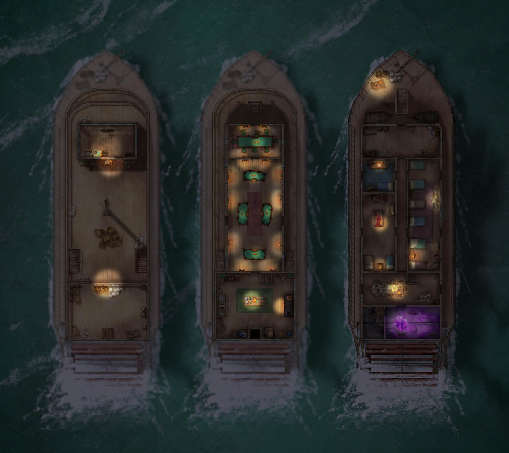 Each Riverboat map includes all ship decks for each variation. This set includes the original Riverboat, Steam Powered, Crystal Powered, the Riverboat Casino, and more – nine variations in all, as hi-res JPEG files. I’ve also created 14 PNG deck assets of the different ship sections to customize or recombine as needed, plus the steam column and more.