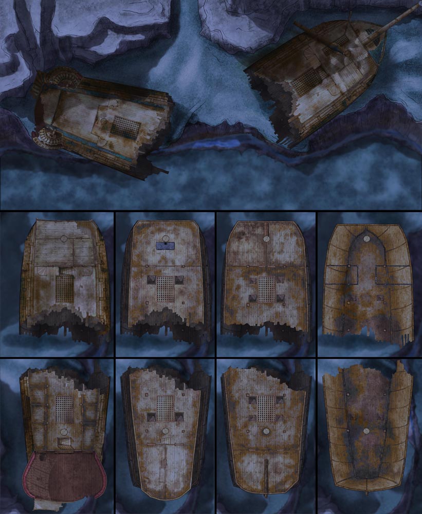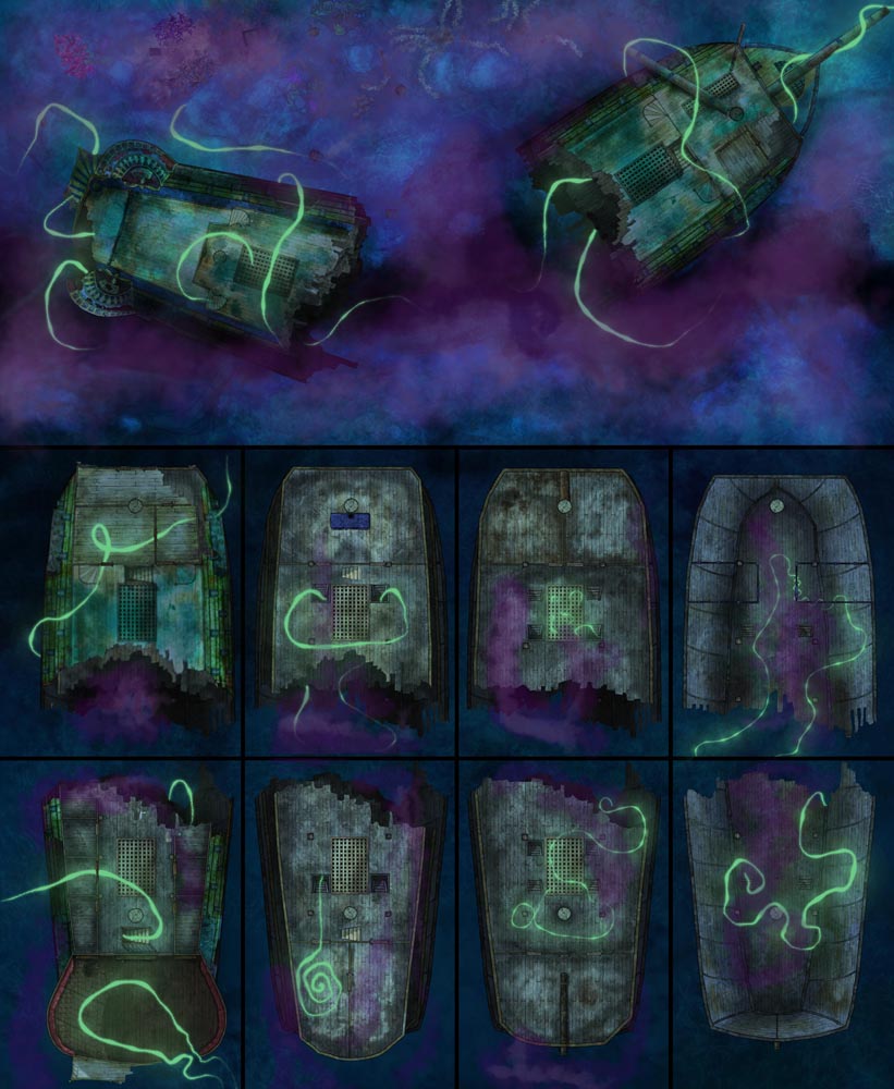 With up to 9 variations, the Shipwrecks map set has plenty of adventure ideas to explore. I used the Ship of the Line as the basis for this wreck. It's obviously a larger ship than many other shipwrecks, but you can always use the assets to leave out levels or resize it to your needs, and this ship is large enough that you can create a dungeon crawl in its ruins!