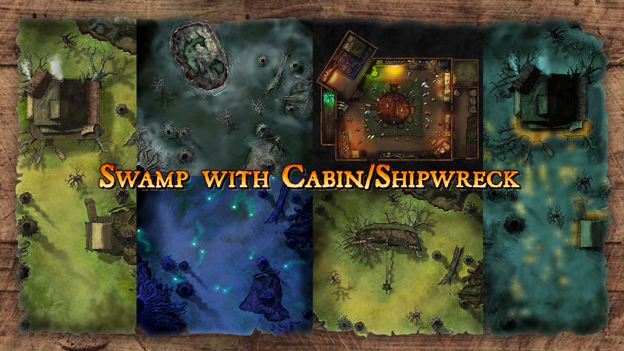 The Swamp with Cabin/Shipwreck map set is designed to let you tailor the maps to your needs, while also offering excellent jumping-off points with several adventure ideas ready to go. Have your players sail into the swamp, and see where things go from there!
