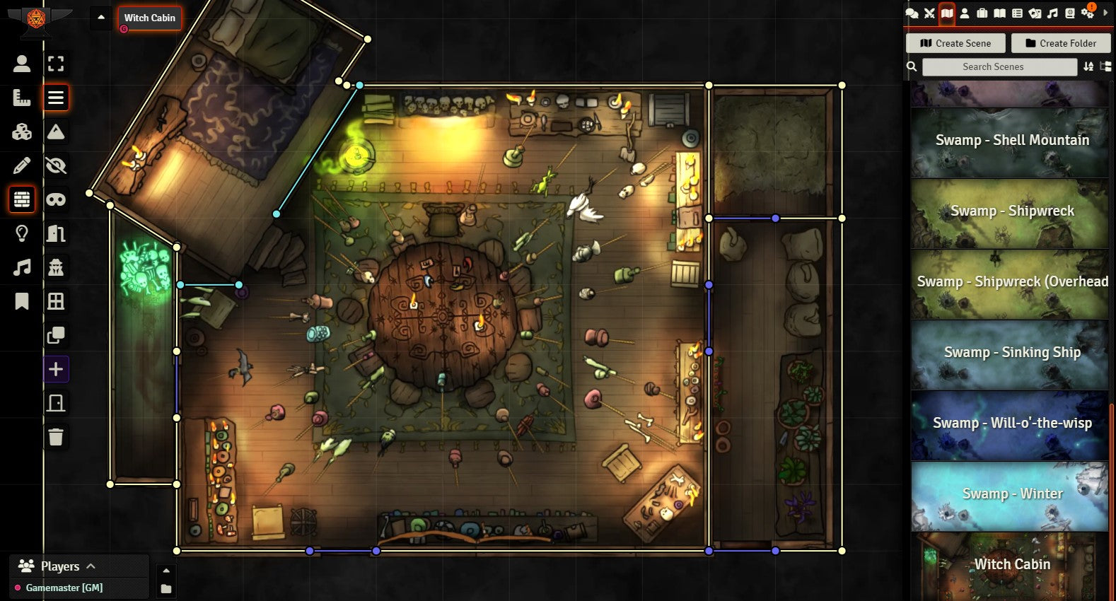 v11. For those who upgrade to the Foundry VTT module, you'll get preset walls, lighting effects, ambient sound effects, and a detailed "hanging bottles" asset you can use to allow players to really feel the ambiance of the cabin.