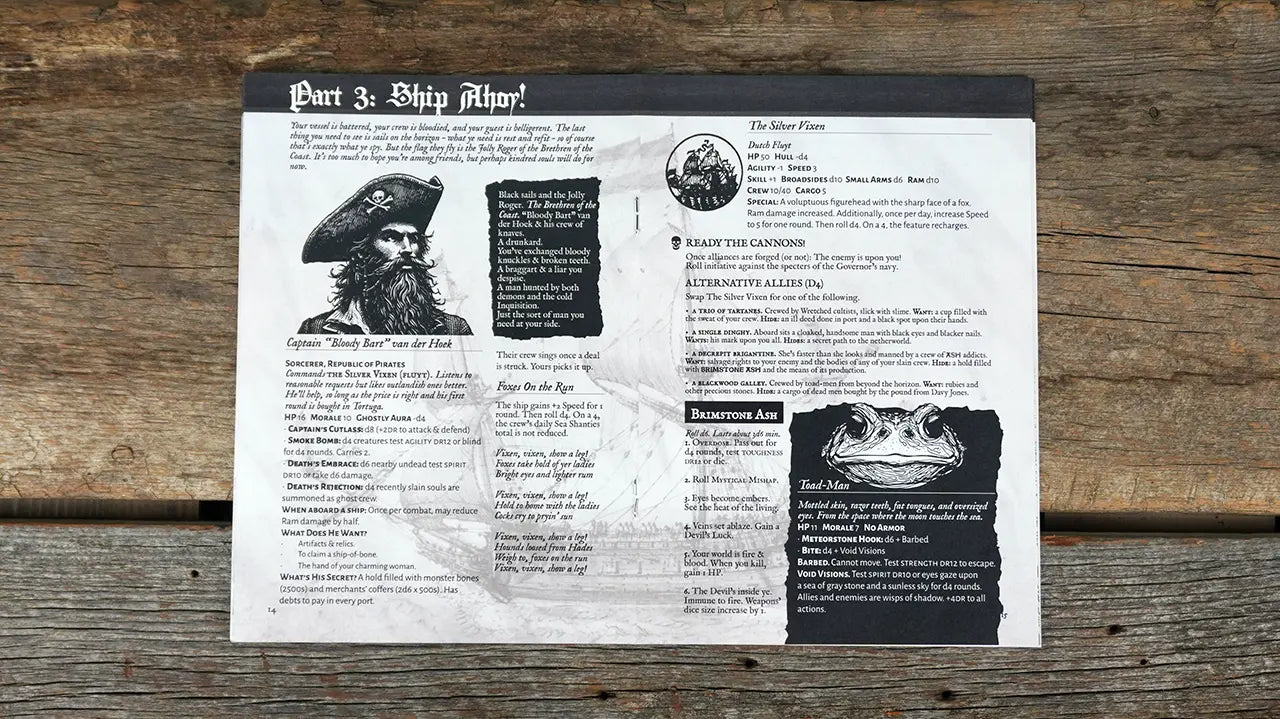 A single adventure told three (or more) different ways. Choose a British, French, or Spanish antagonist to set loose on a high seas chase where your crew must choose between the lesser of evils at every turn!