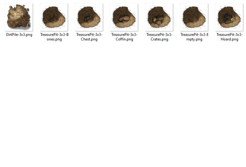 - 8 Buried treasure location battlemaps (bones, chest, coffin, crates, empty, no hole, trove of chests, Tree X marks the spot)