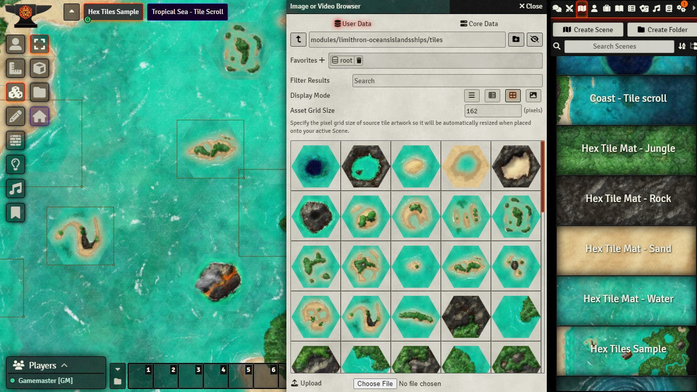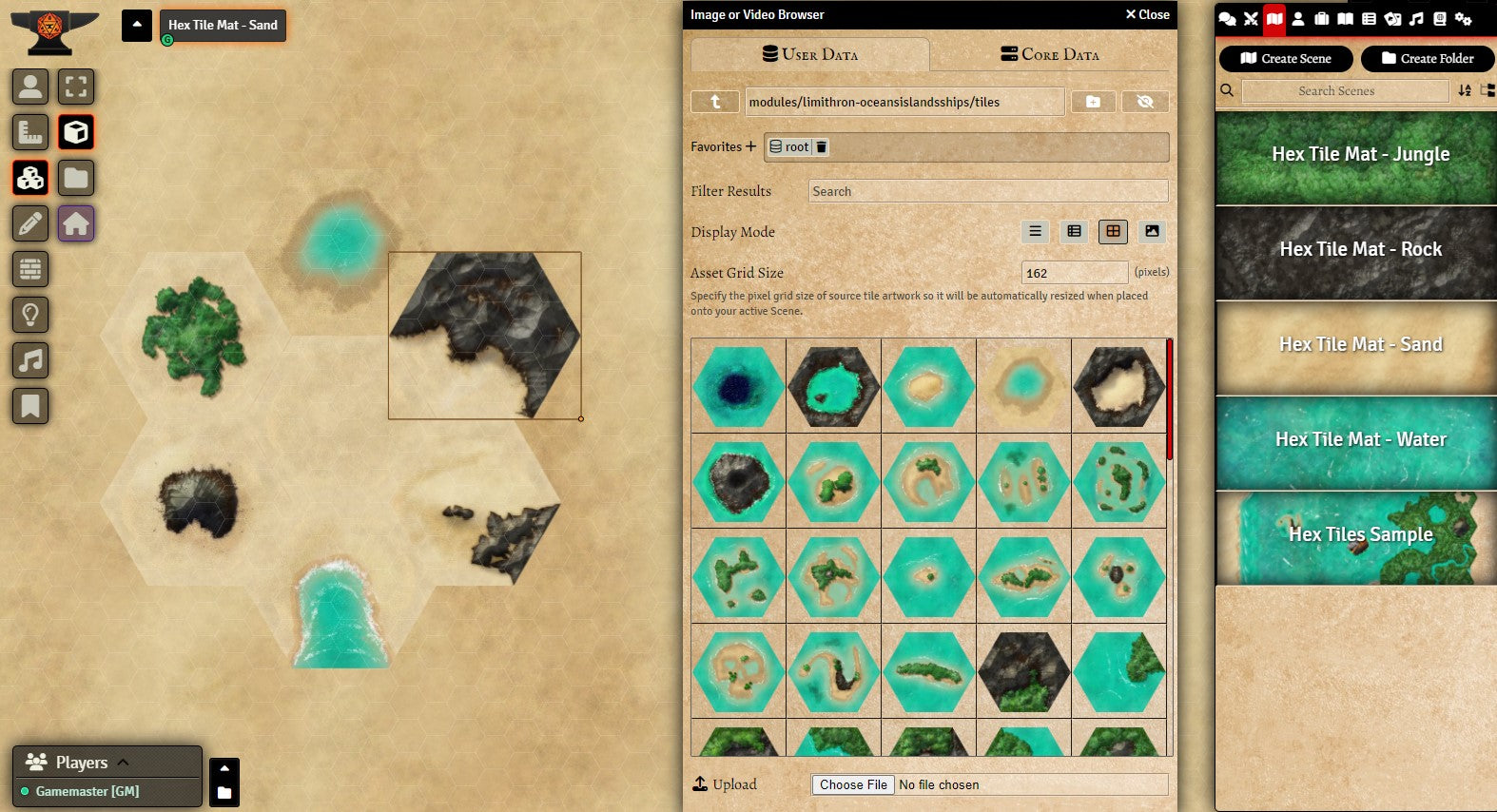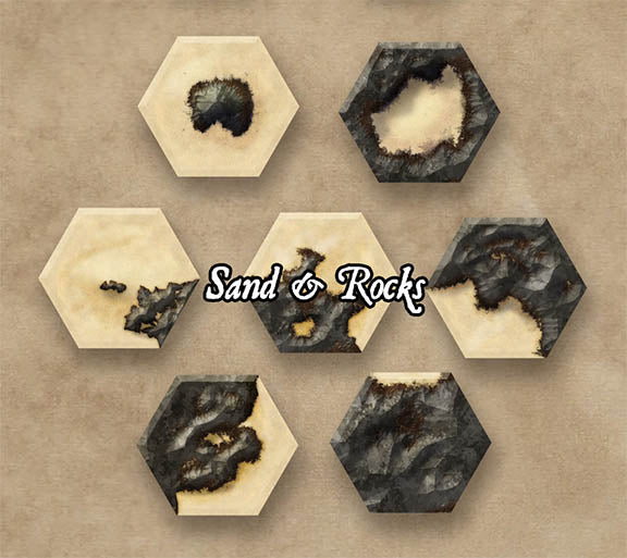 This tile set was designed to work very well with the Oceans, Islands, and Ships release, so you can mix and match terrain features, coast lines, larger islands, etc. In fact, if you've already purchased Oceans, Islands, and Ships for Foundry, you'll find the module has been updated to include these hex tiles. Head over to that set's page to pick them up.
