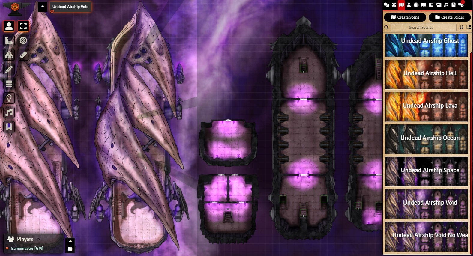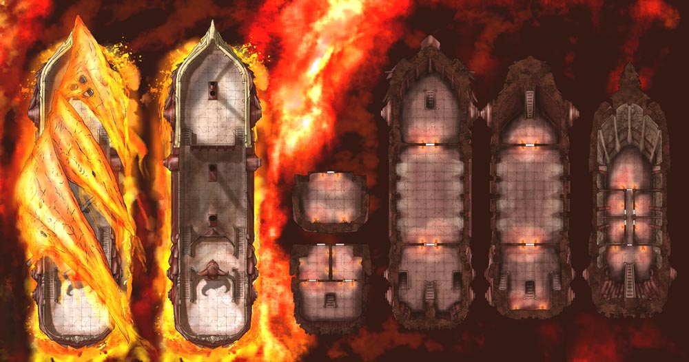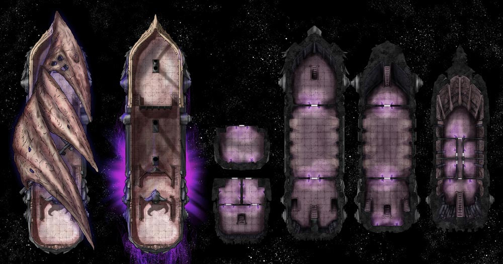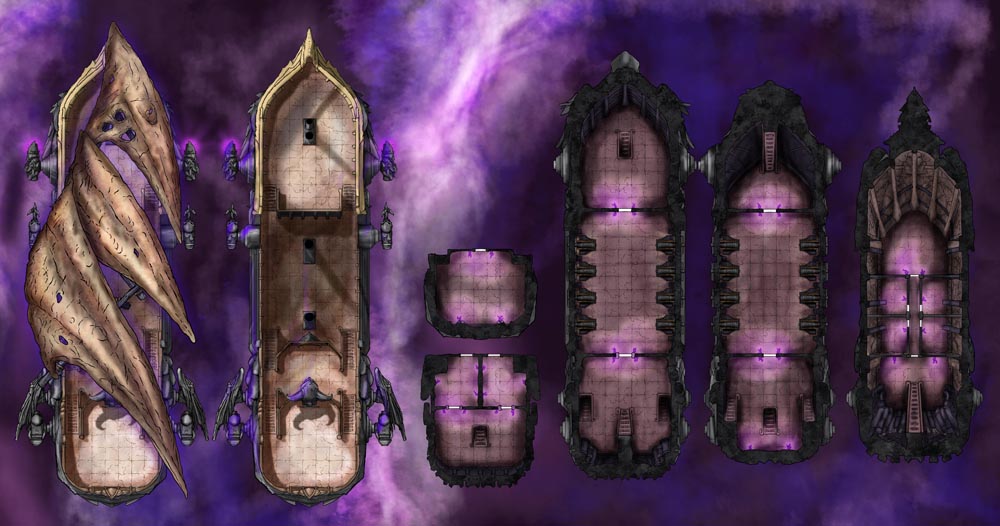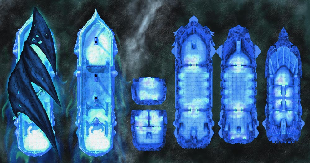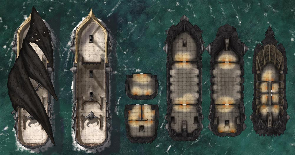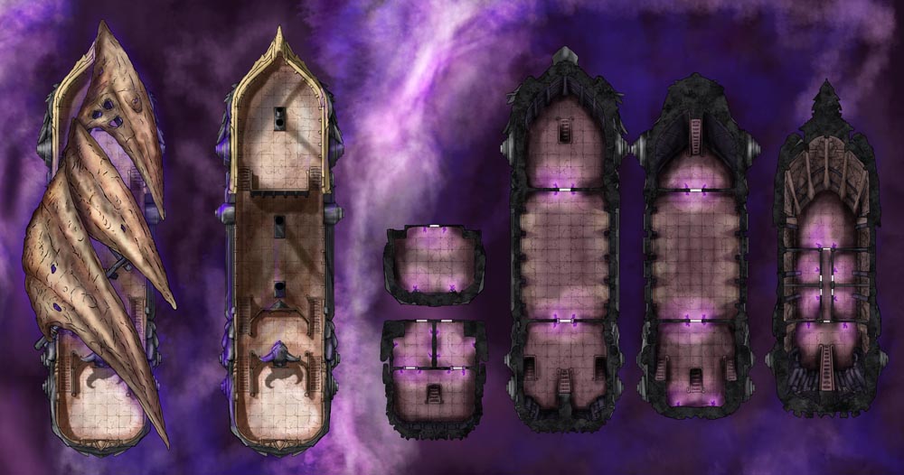 Sailors have sighted the Undead Airship and retired on the spot. How will your players react to the foul ship and its damned crew? Each map includes all ship decks, allowing you to set entire adventures aboard the vessel. Variations of this set include the original Void Ship, a Hell Airship, Ghost Ship, Lava Ship, and more – seven styles in all. I’ve also created 41 PNG assets of the different ship sections, weapons, and such, letting you customize or use them with other scenarios.