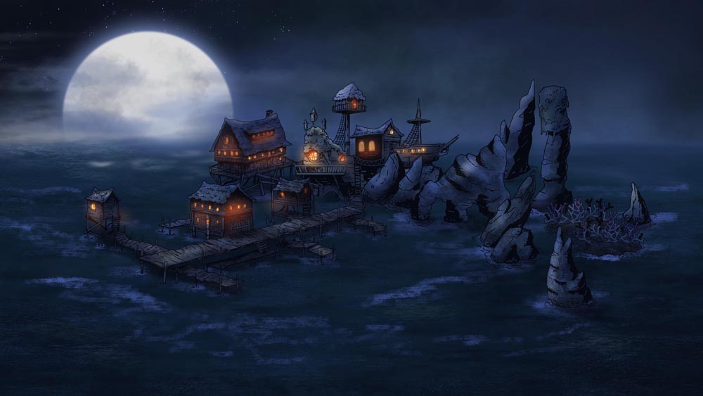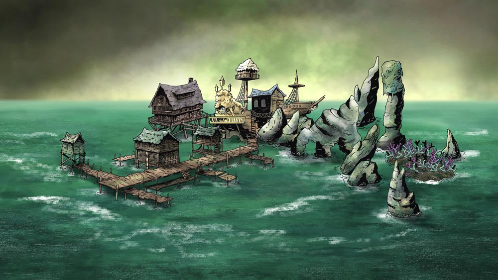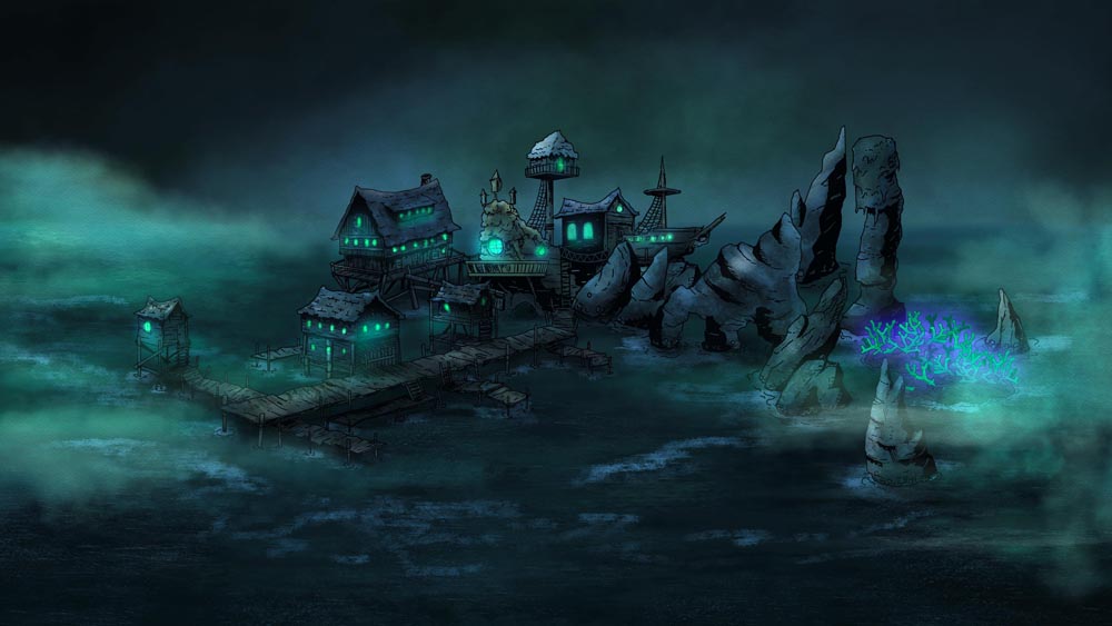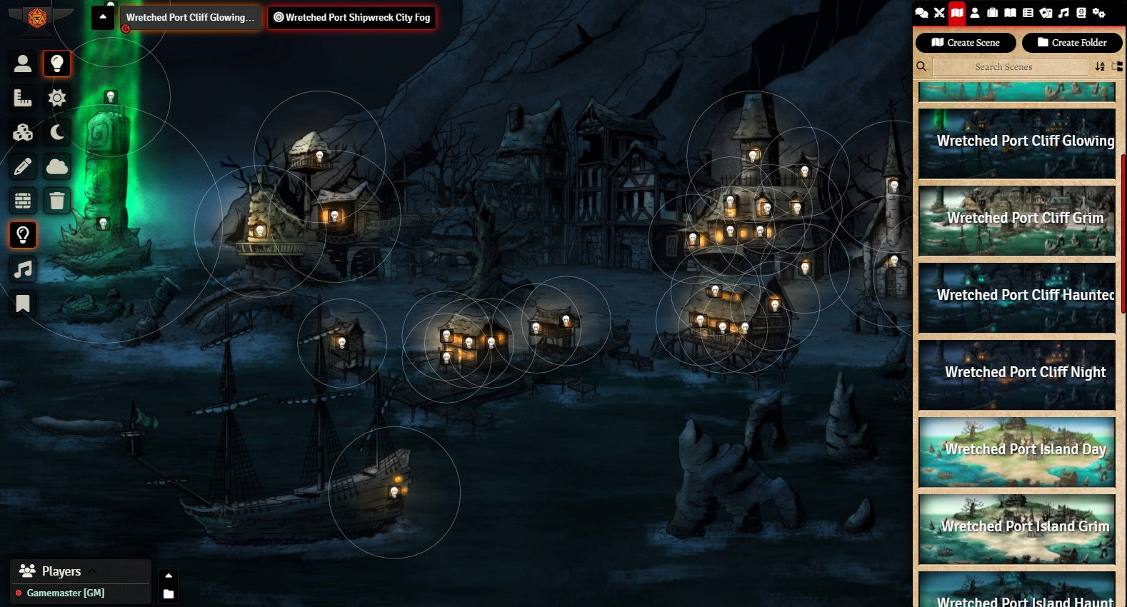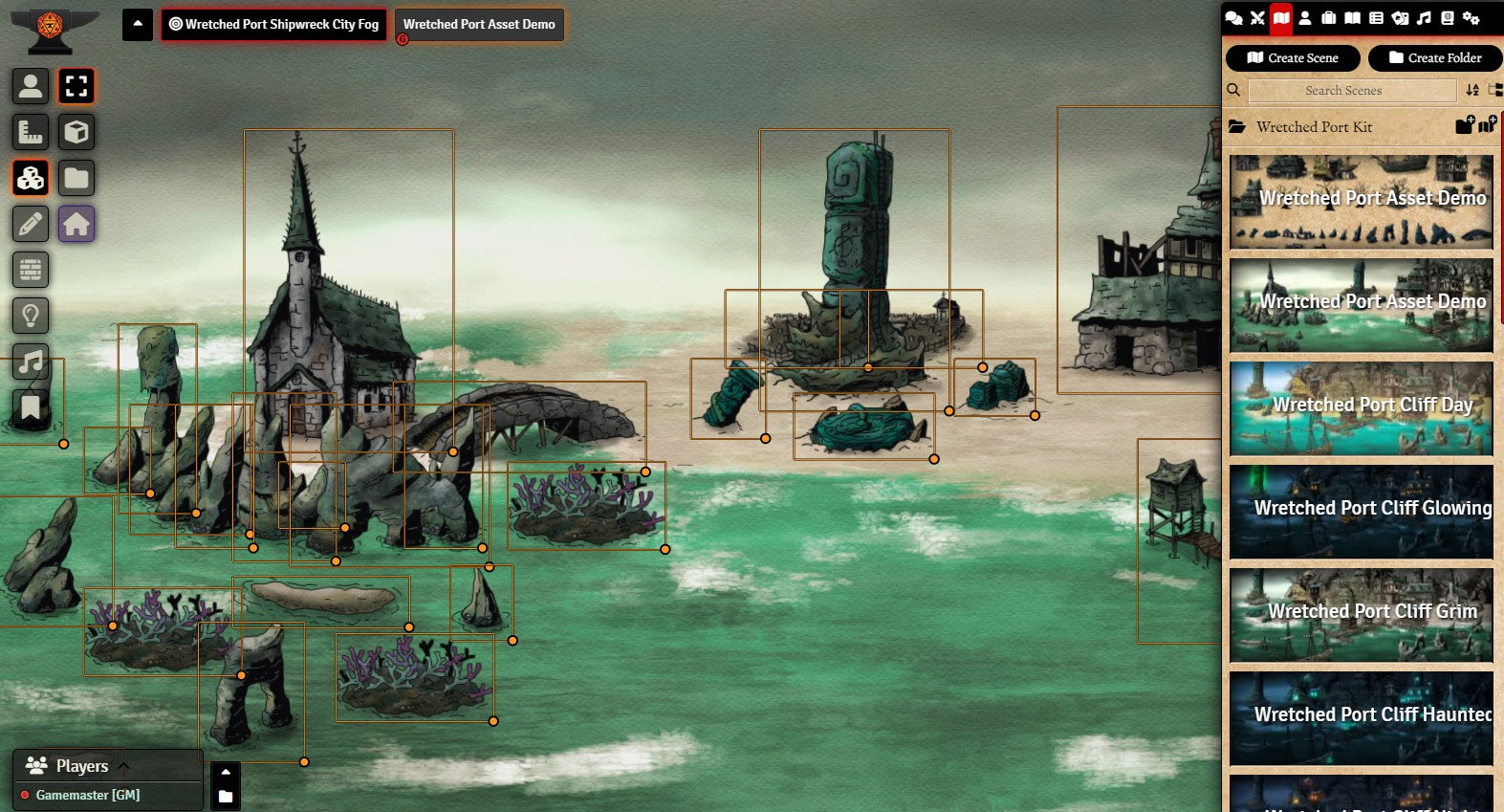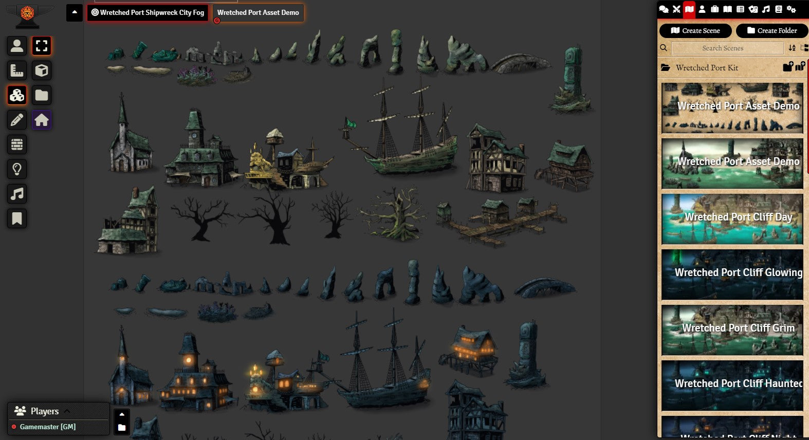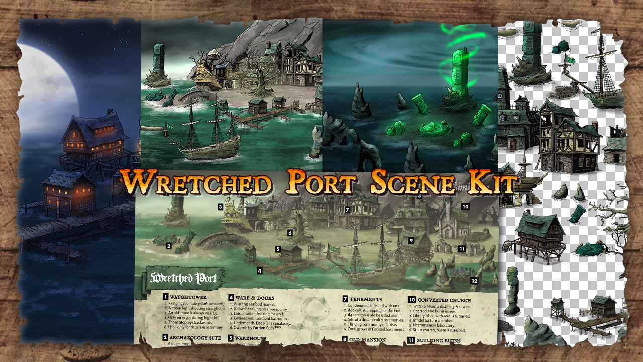 I’ve included 12 premade scenes, a PDF of the Wretched Port generator from the book, and over 60 assets that you can drag and drop either in your VTT or in an application like Photoshop, GIMP, or MS Paint.